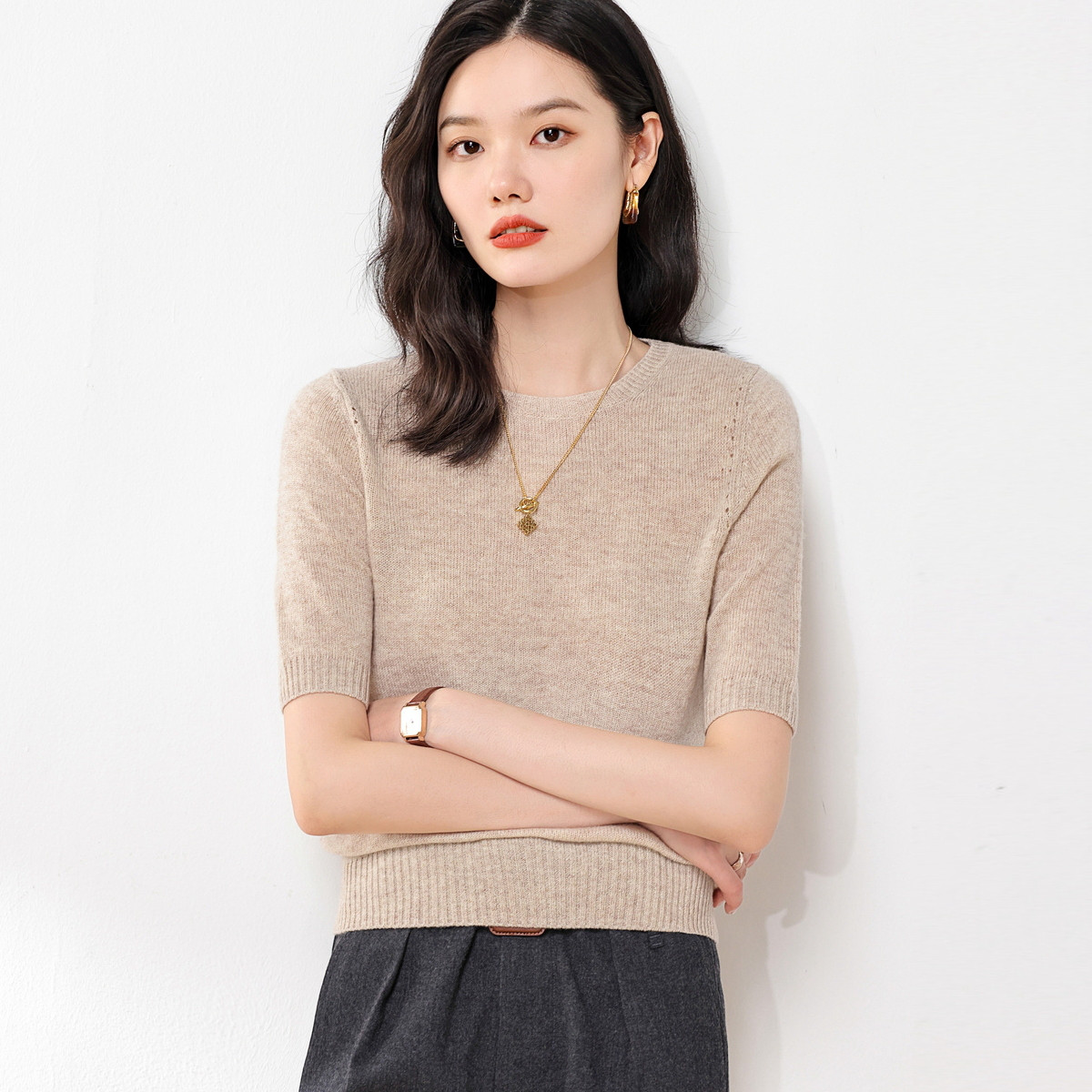 【羊毛混纺】纯色圆领短袖T恤套衫简约百搭针织打底衫毛衣线衫 672915