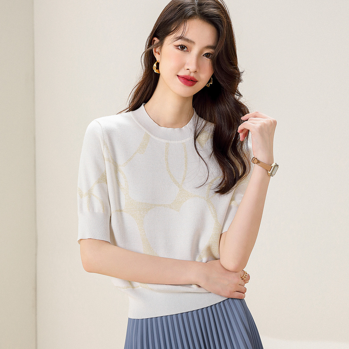 圆领爱心提花含桑蚕丝针织打底衫短袖T恤针织衫女 715347
