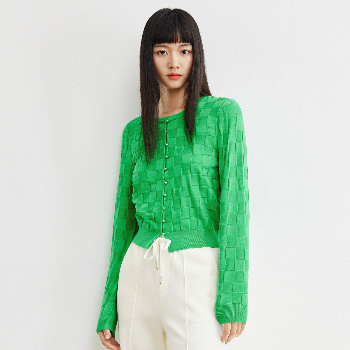 时尚百搭显瘦纯色针织开衫女秋冬格纹单排扣气质修身圆领毛衣女 337539