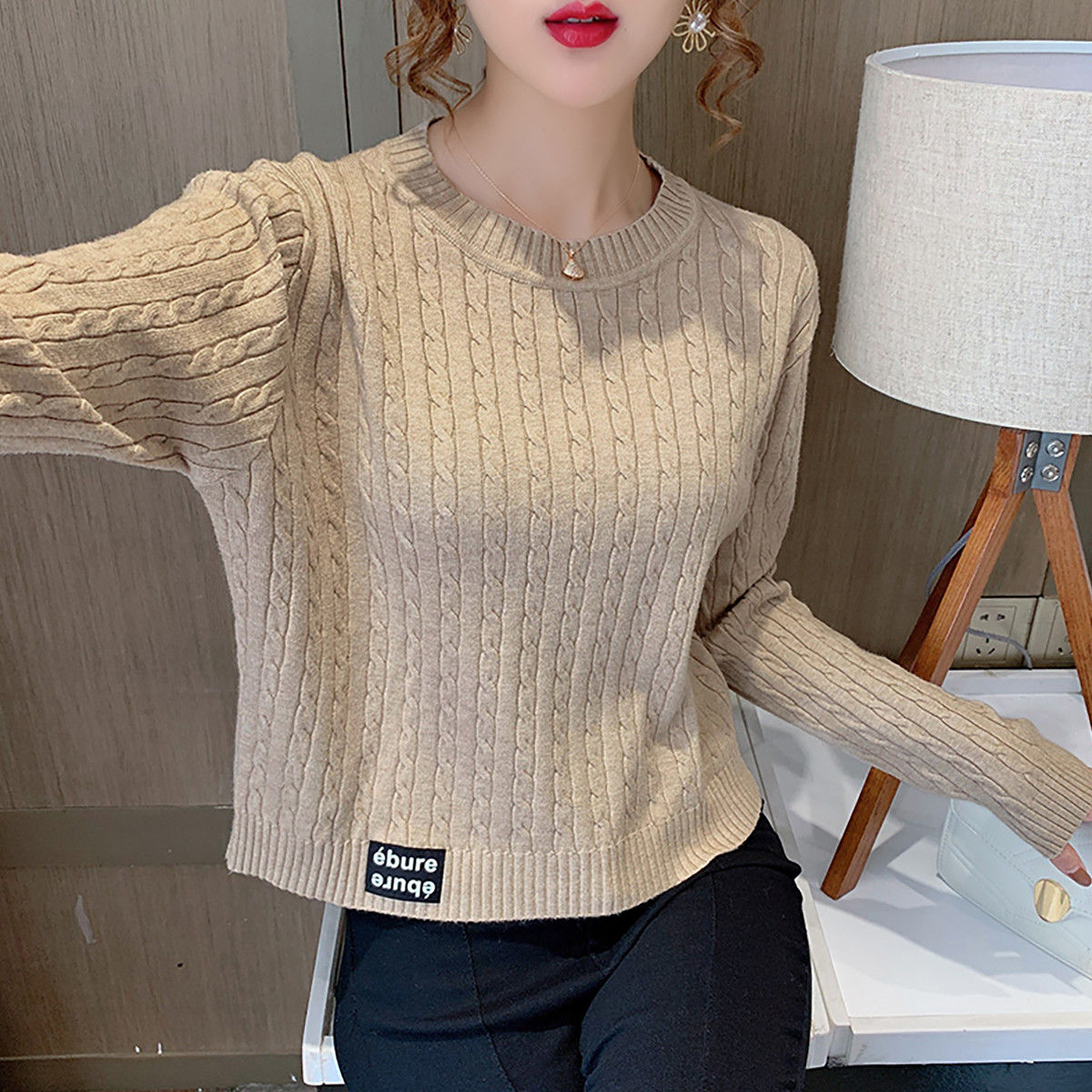 圆领针织衫麻花打底上衣长袖针织衫女 064131