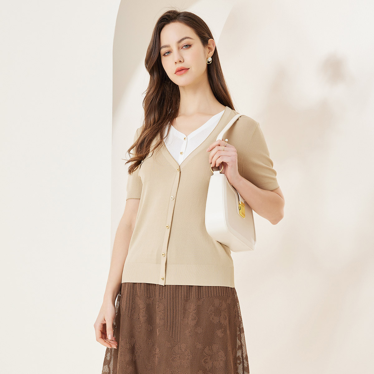 【含天丝桑蚕丝】春夏专柜修身v领拼色针织开衫气质百搭时尚 618897