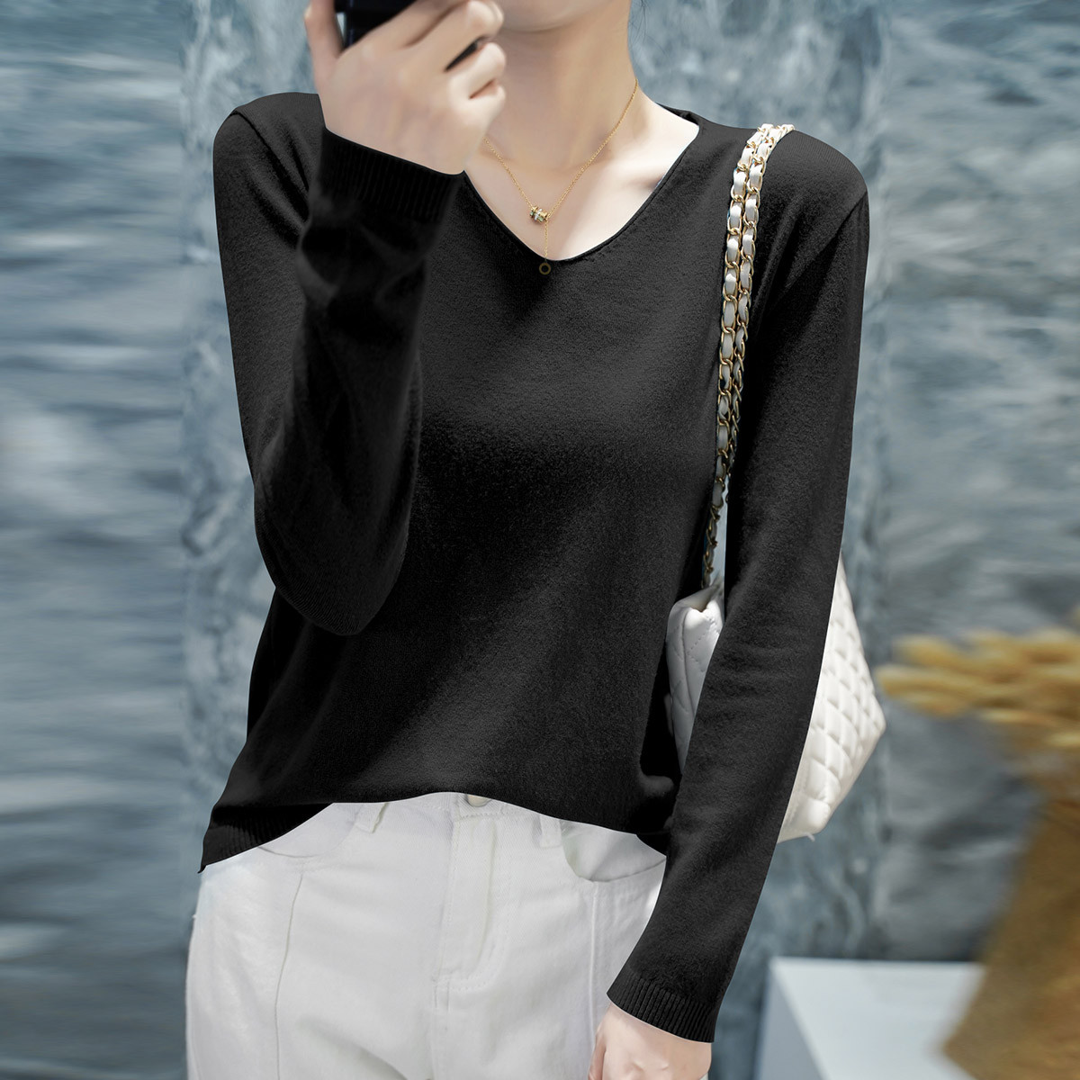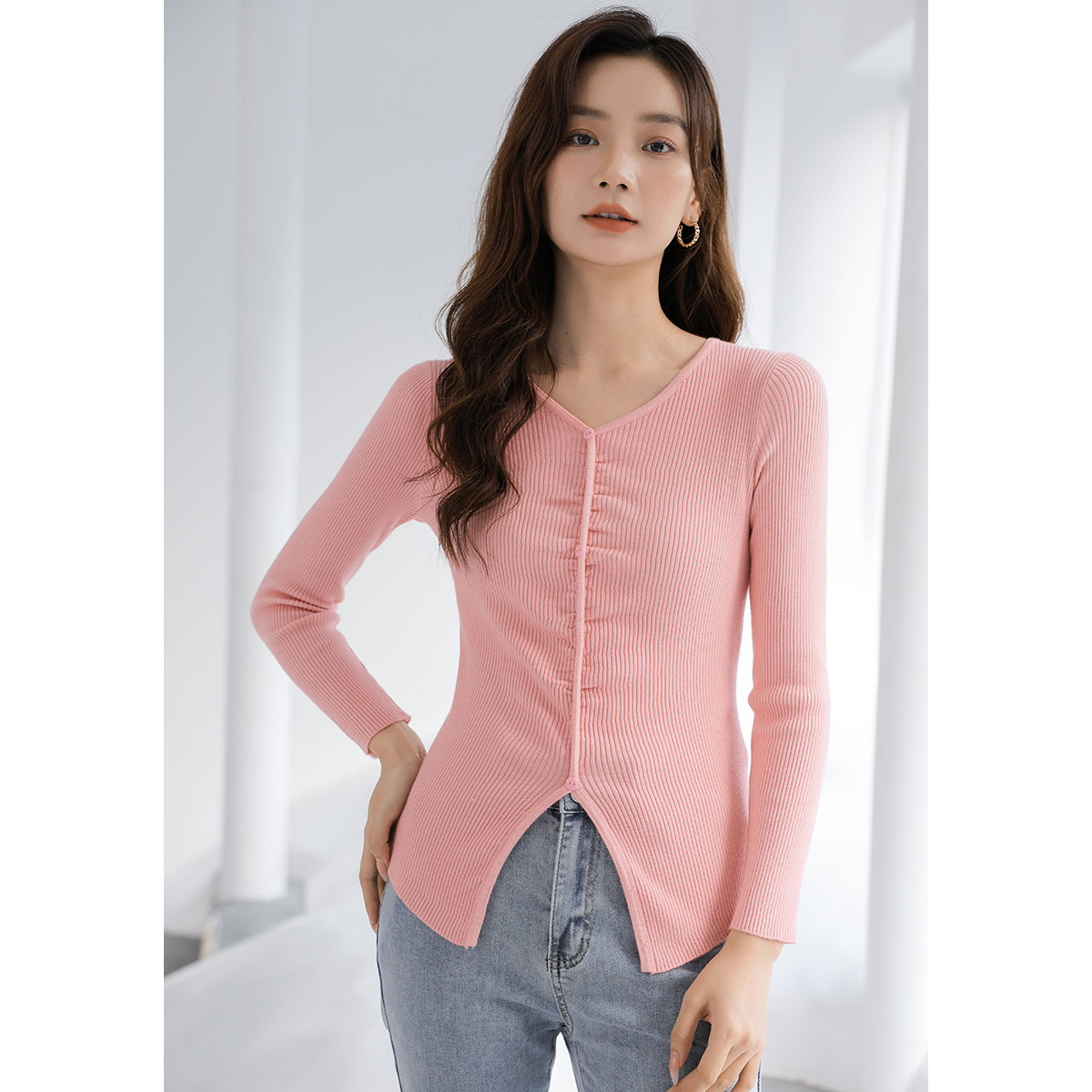 小众开叉V领长袖针织衫女百搭针织上衣针织衫女女 357763