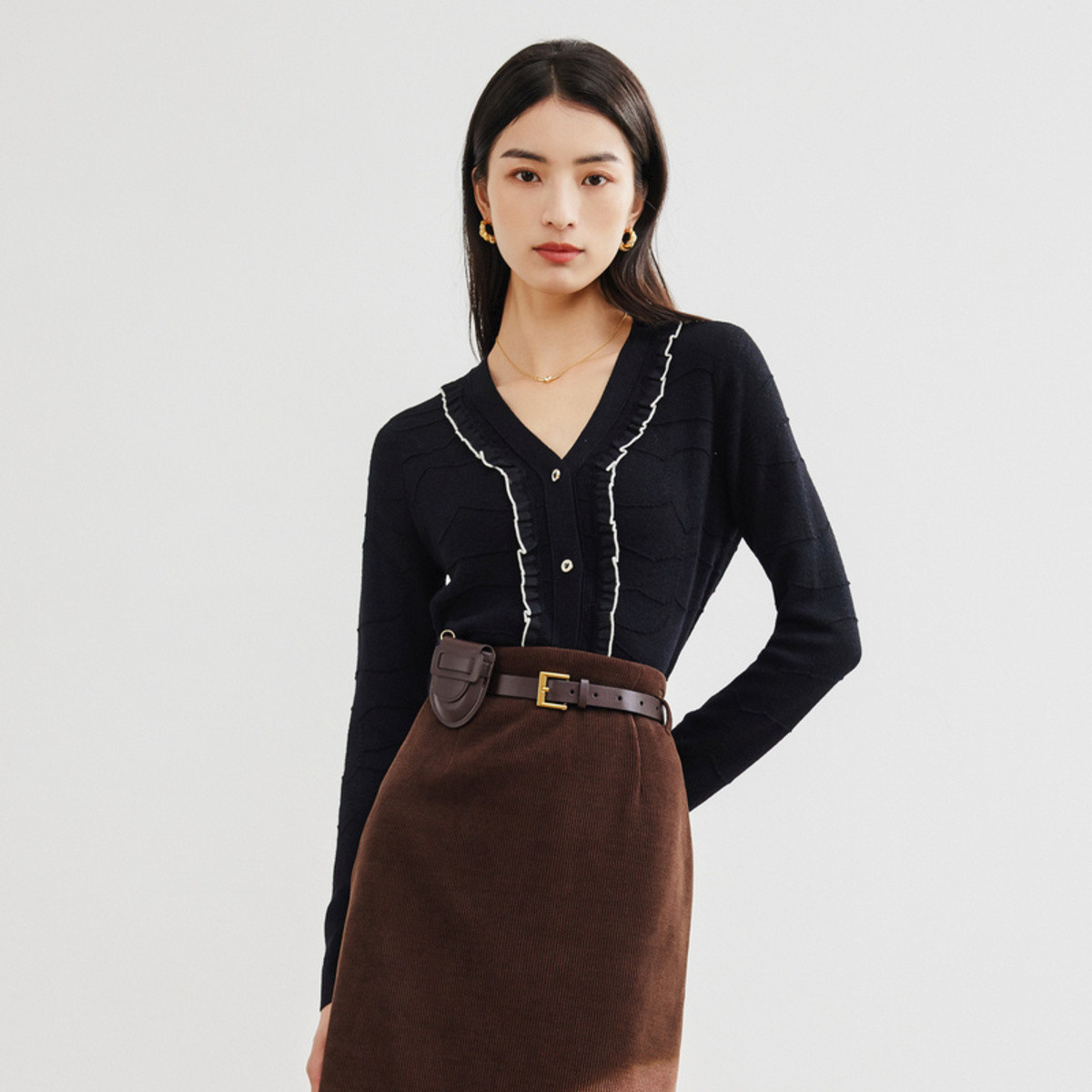 气质v领针织开衫女春秋撞色设计感百搭荷叶边长袖针织衬女上衣 583683