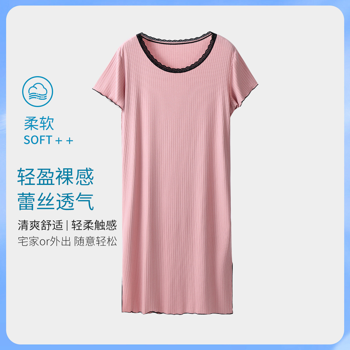 【蕾丝舒适透气】夏高弹条纹短袖中长裙女士睡衣家居服可外穿睡裙 889374