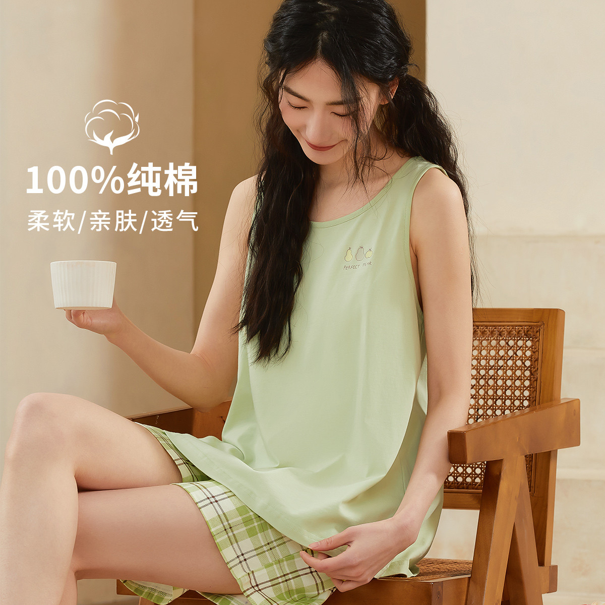 【100%棉】纯色圆领无袖背心格纹短裤套装女士夏季家居服透气 834635