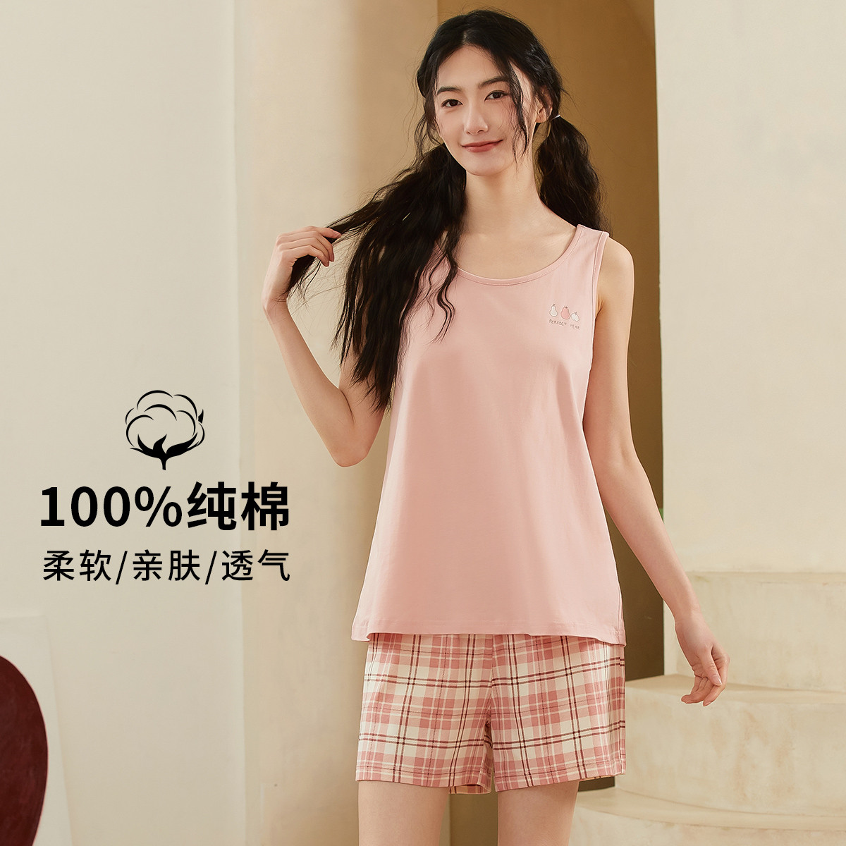 【100%棉】纯色圆领无袖背心格纹短裤套装女士夏季家居服透气 797771