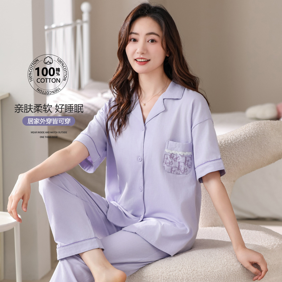 【100%纯棉舒适】春夏翻领纯棉亲肤透气可外穿女士睡衣家居服 327838