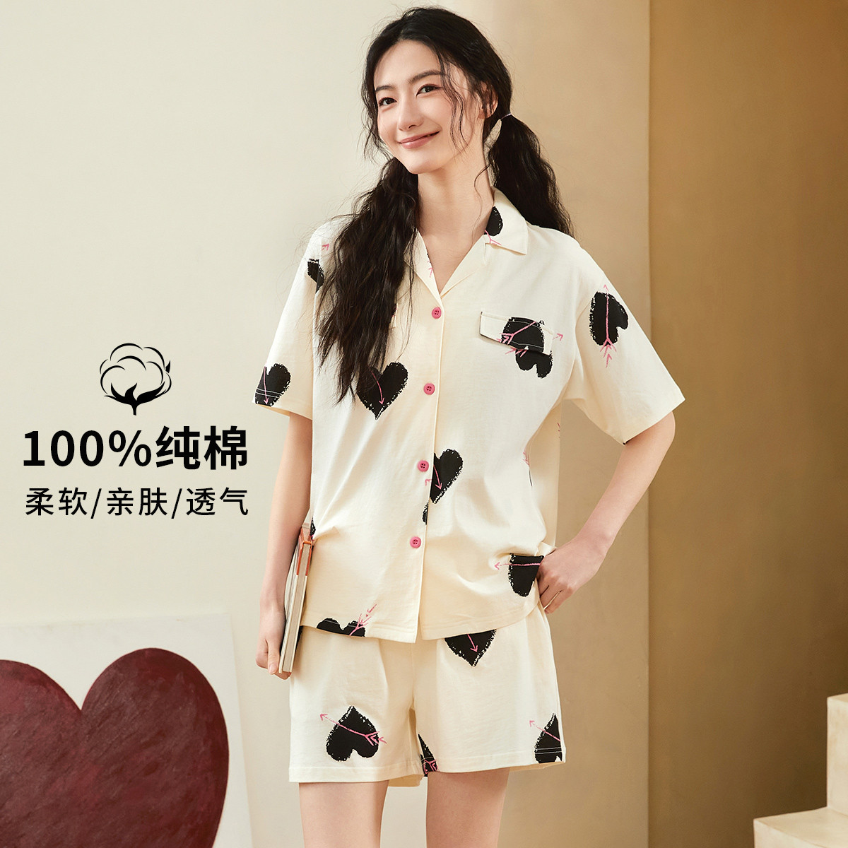 【100%棉】纯棉柔软舒适爱心套装睡衣女士睡衣家居服亲肤透气 623307