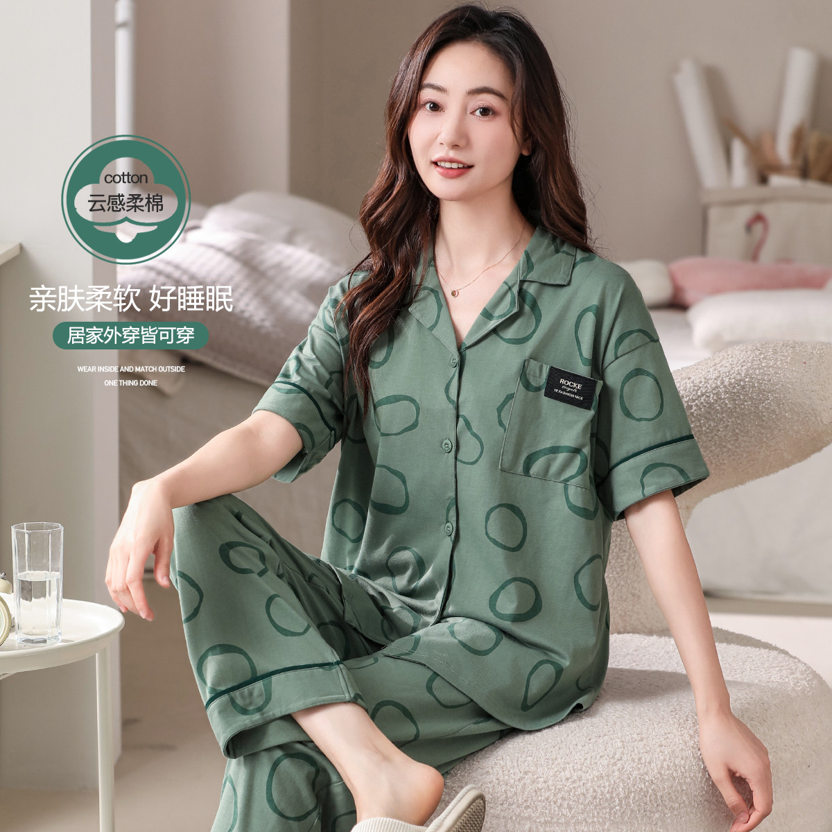 【棉感亲肤】春夏简约舒适居家短袖长裤可外穿女士睡衣家居服套装 156254
