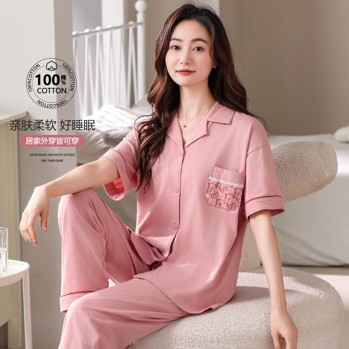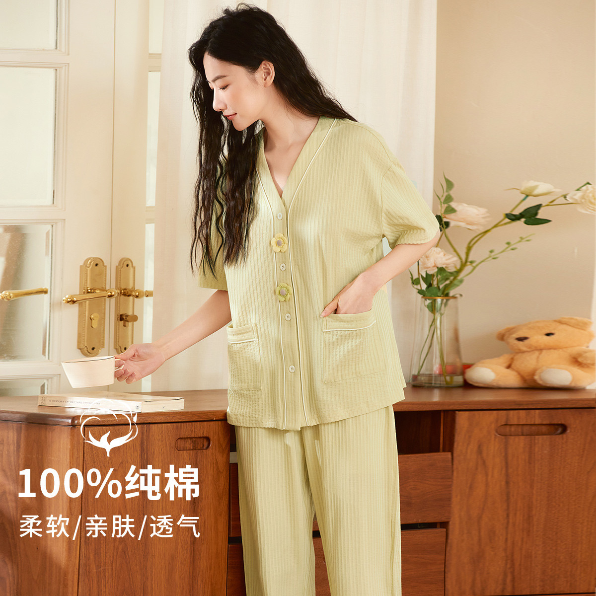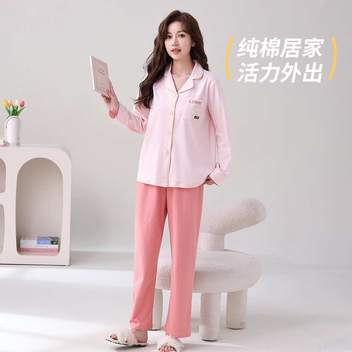 【100%棉】翻领开衫睡衣女士春秋款亲肤纯棉家居服套装可外穿 315275