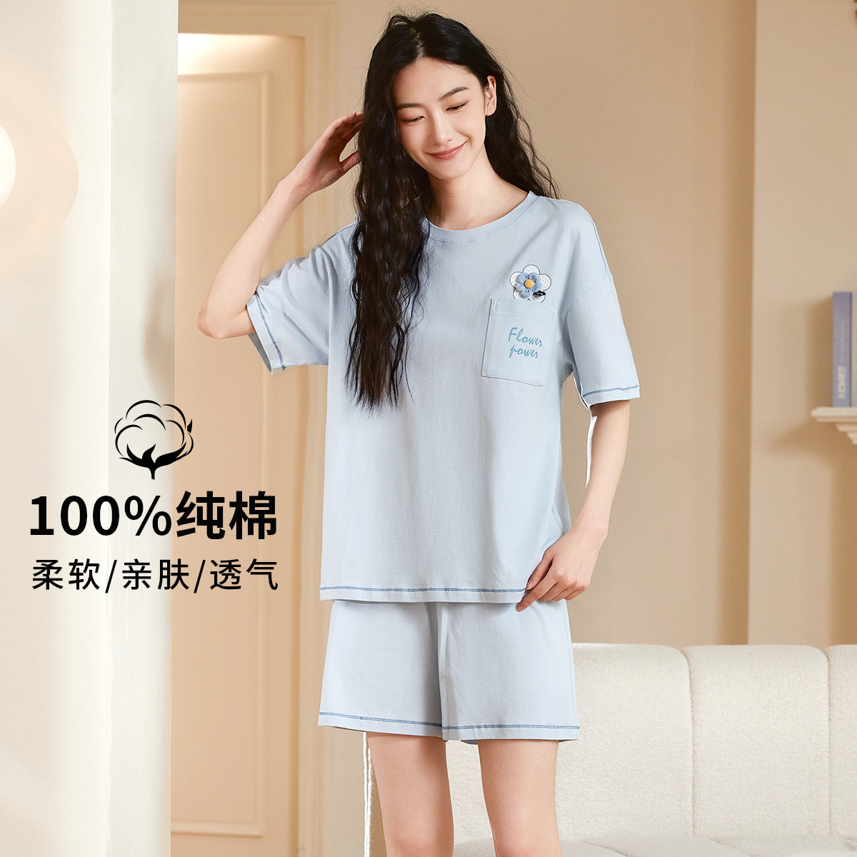 【100%棉】简约圆领印花短袖短裤套装女士家居服柔软舒适透气 320011