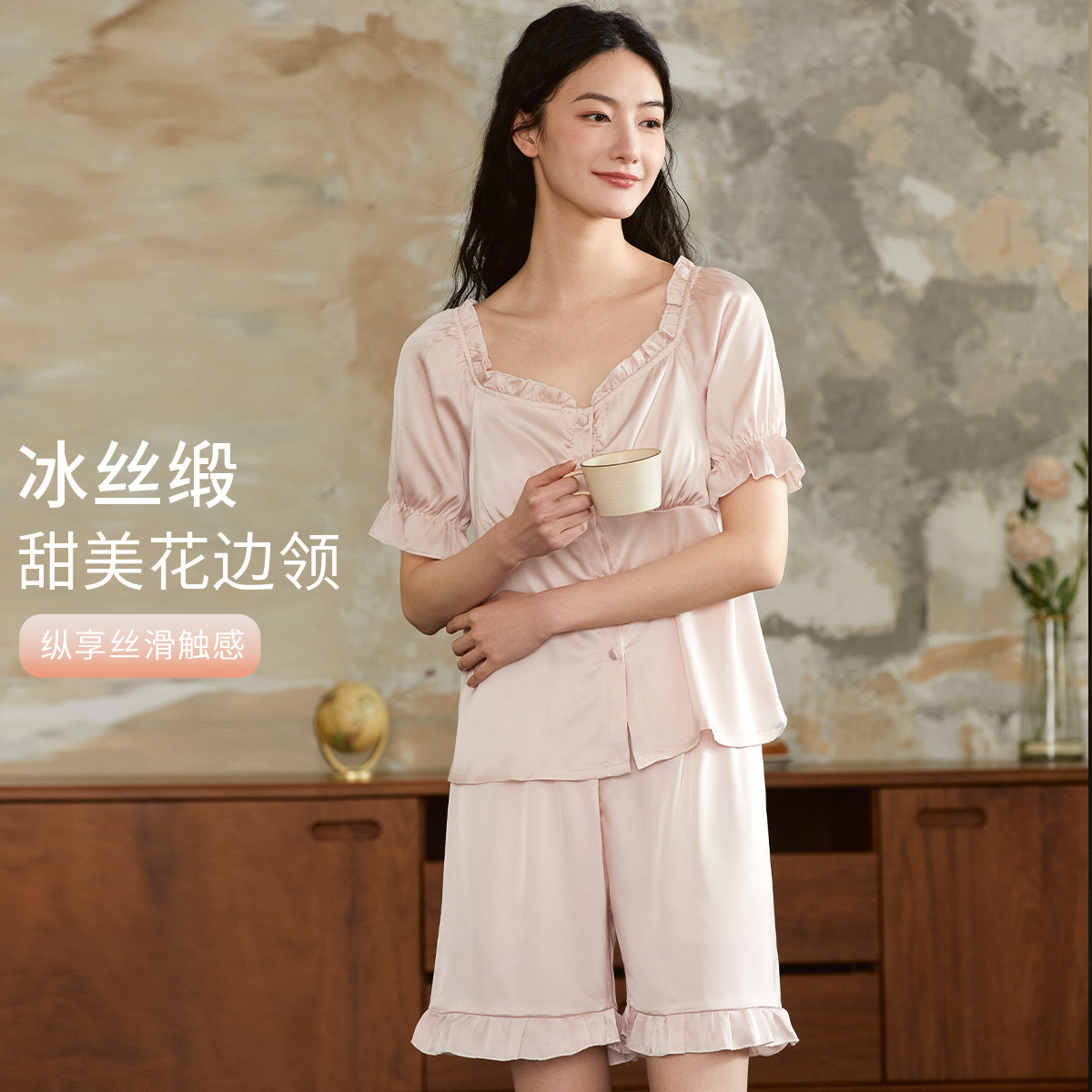 【甜美花边】冰丝缎方领触感丝滑短袖睡衣女士夏季家居服自带胸垫 050763