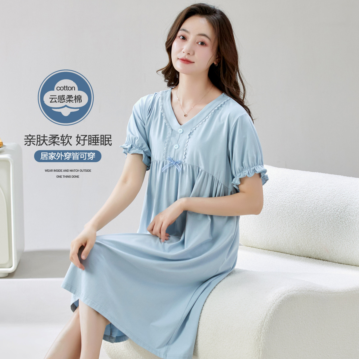 春夏棉柔亲肤V领短袖中长裙女士睡衣家居服可外穿睡裙 621342