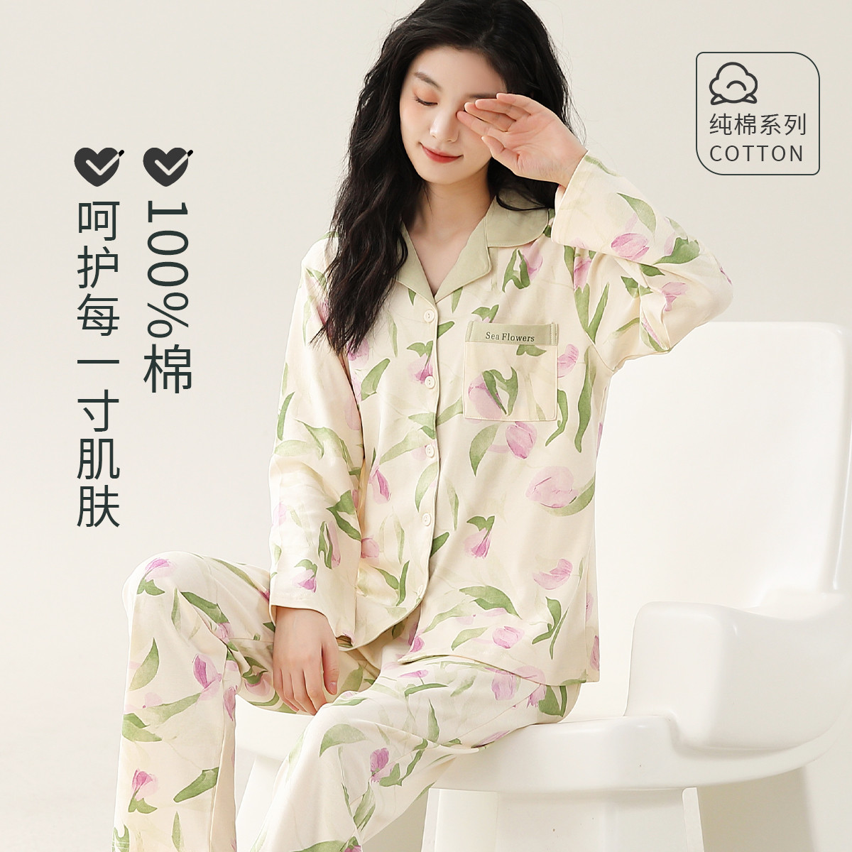 【100%棉】女士睡衣纯棉家居服翻领长袖长裤两件套睡衣套装女 629643