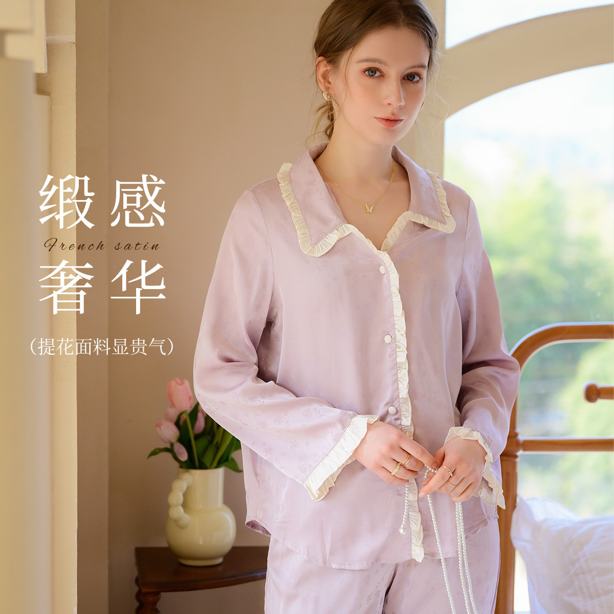 【优雅花边缎面】春夏款长袖睡衣女可外穿高级感冰丝家居服套装 785163