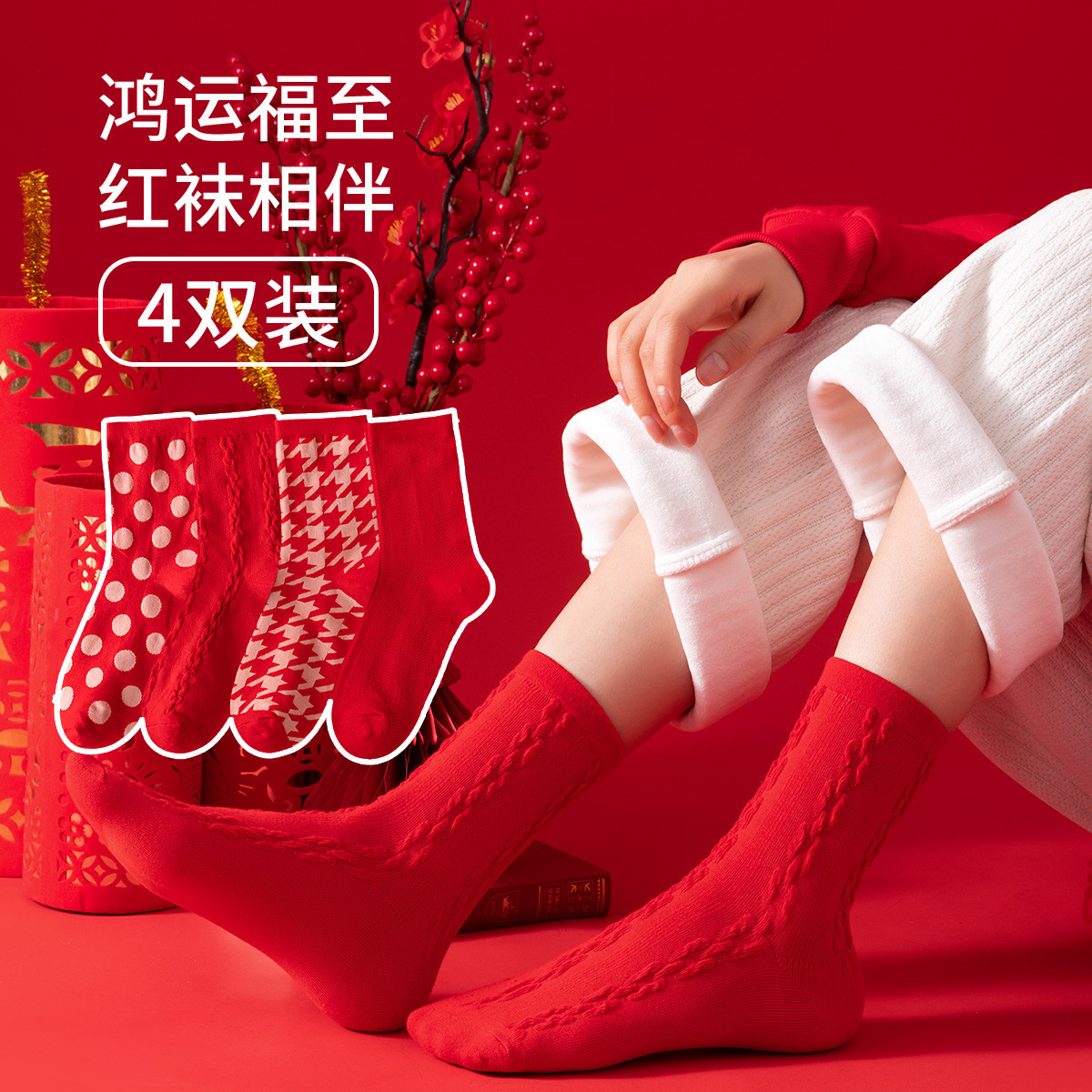 【鸿运红袜】4双装喜庆中筒袜秋款舒适透气女士袜子红品 229899
