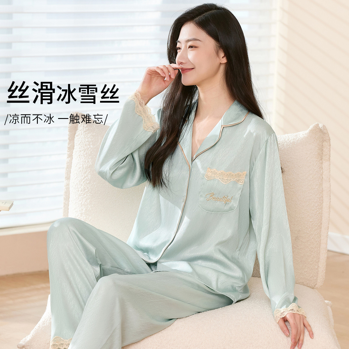 【薄荷冰雪丝】拼接蕾丝舒适柔软长袖睡衣女士家居服细腻翻领套装 633995