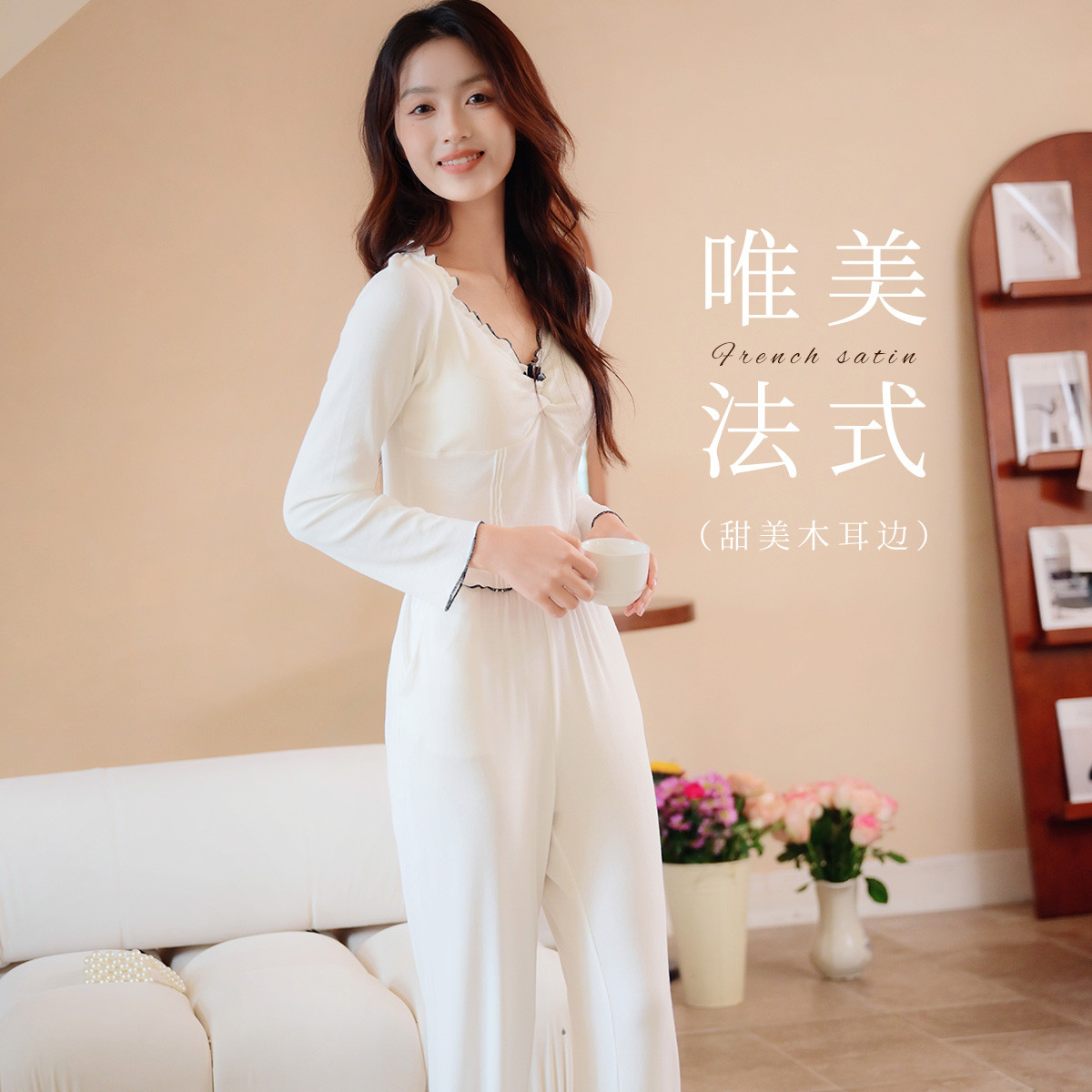 【带胸垫】法式浪漫春款V领睡衣女可外穿高级感木耳边家居服套装 779467