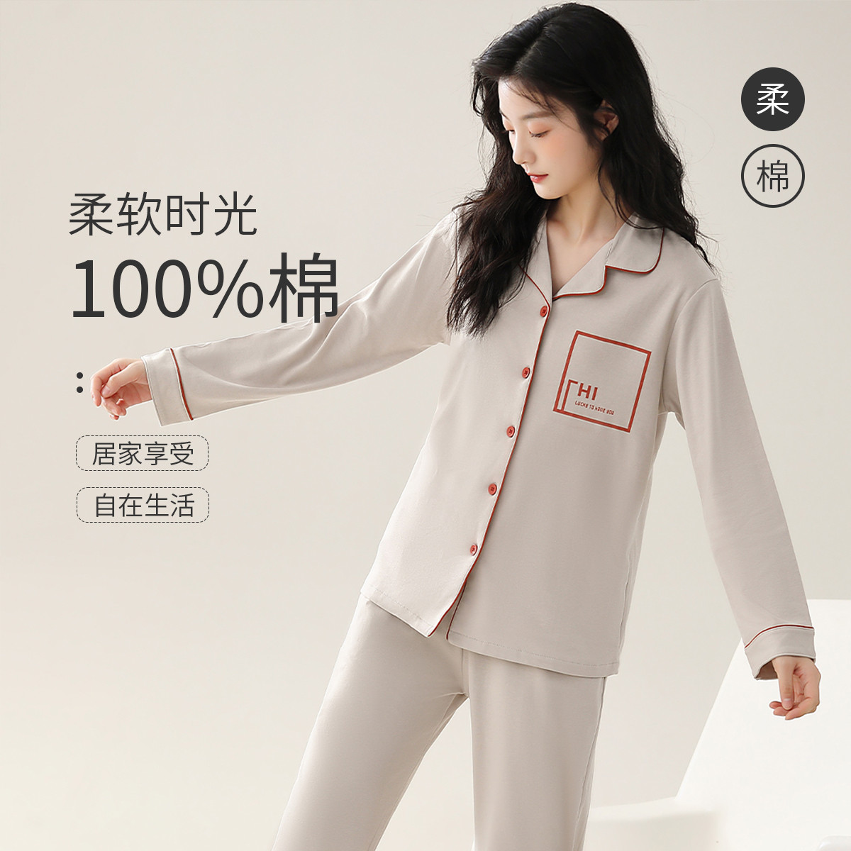 【100%棉】可外穿家居服套装女士春秋款高级感长袖长裤睡衣 607883