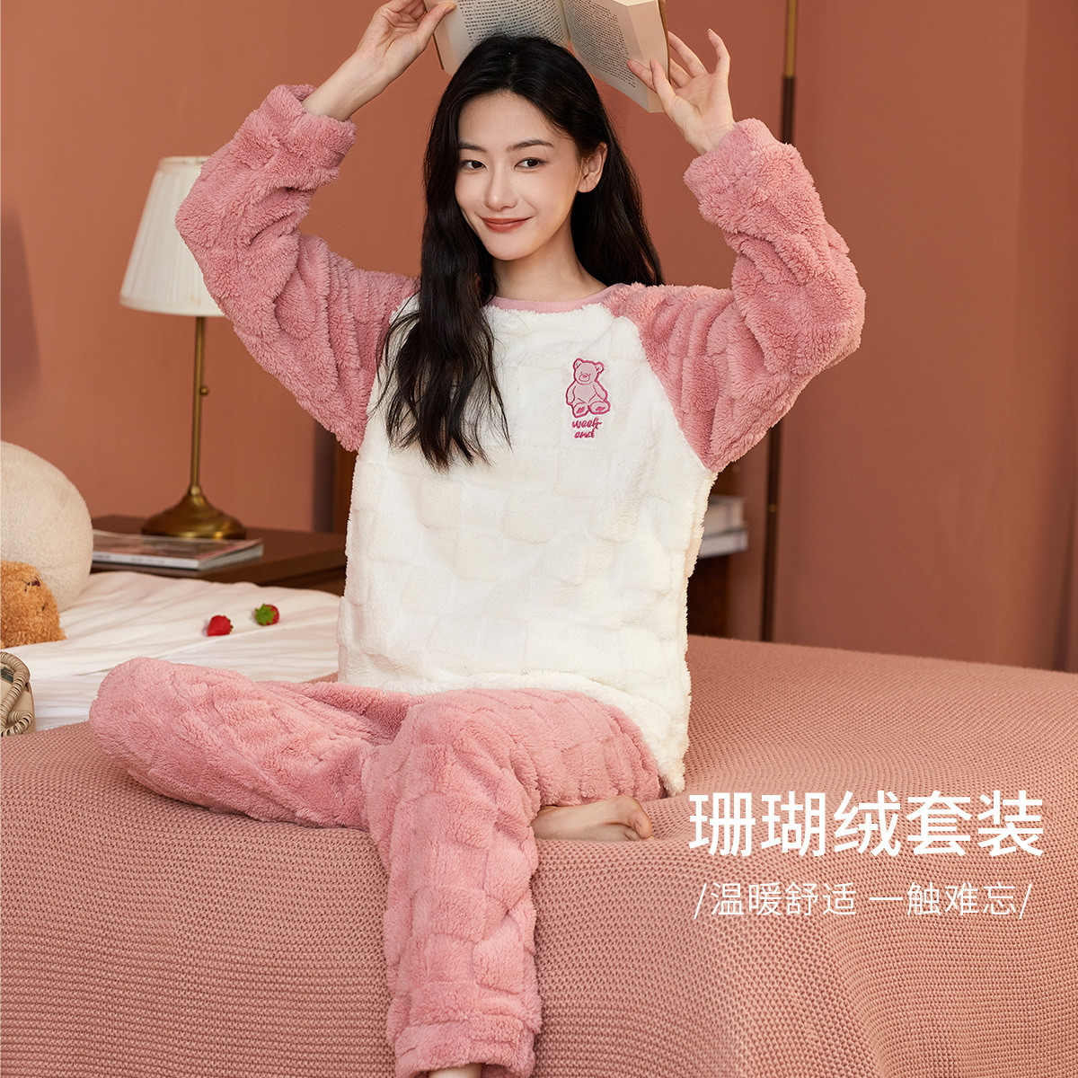 【珊瑚绒】套头舒适撞色柔软保暖睡衣女士家居服长袖亲肤套装 007627