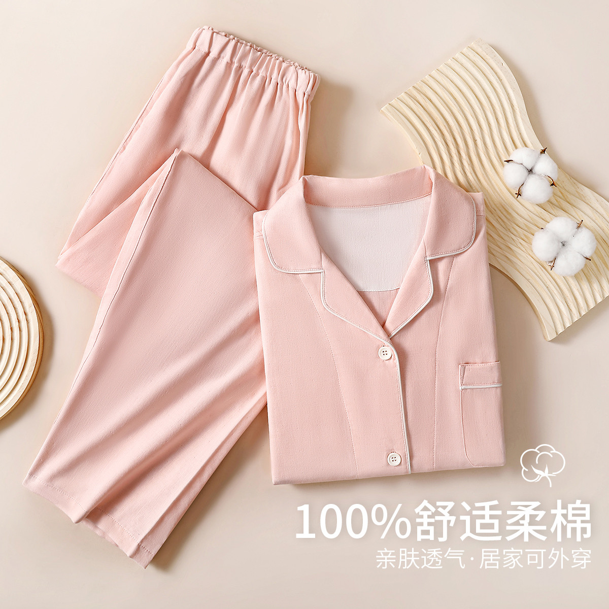 【100%棉】女士纯棉睡衣亲肤透气家居服翻领睡衣两件套套装女 438411