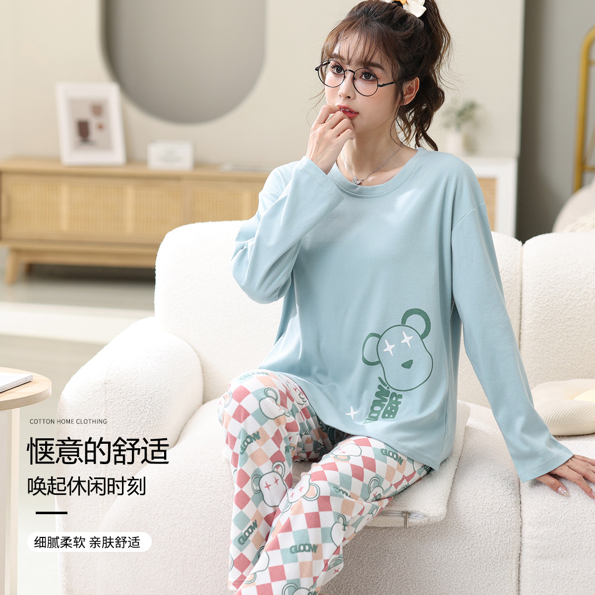 【100%纯棉】春秋女士家居服套装高级感睡衣女柔软长袖可外穿 123738