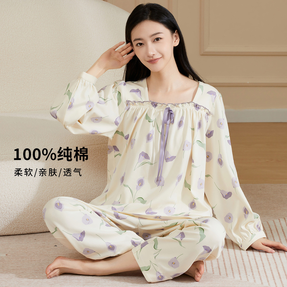 【100%棉】温柔花园睡衣女纯棉长袖套装舒适亲肤女士家居服 503499