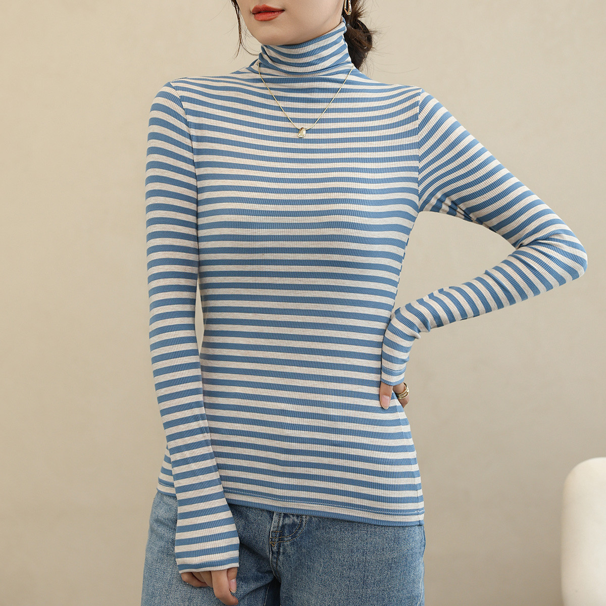 【条纹高领打底衫】秋冬款修身内搭女士打底T恤长袖修身上衣女 914379