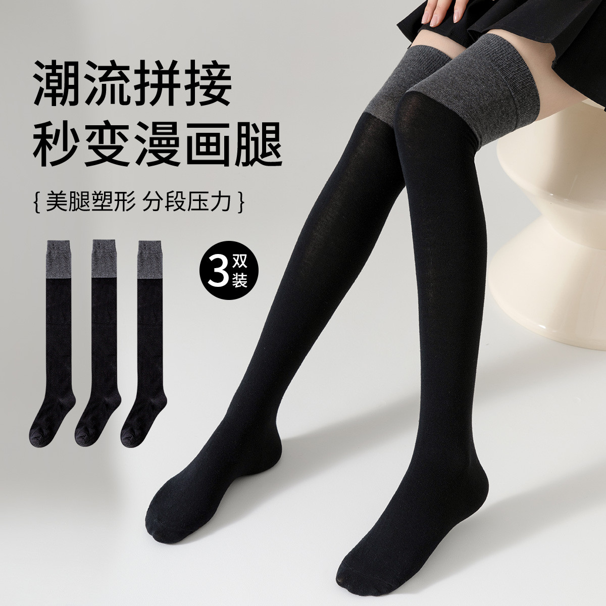 【潮流美腿显瘦】3双装女袜拼接撞色过膝袜舒适棉柔长筒袜ins 417675