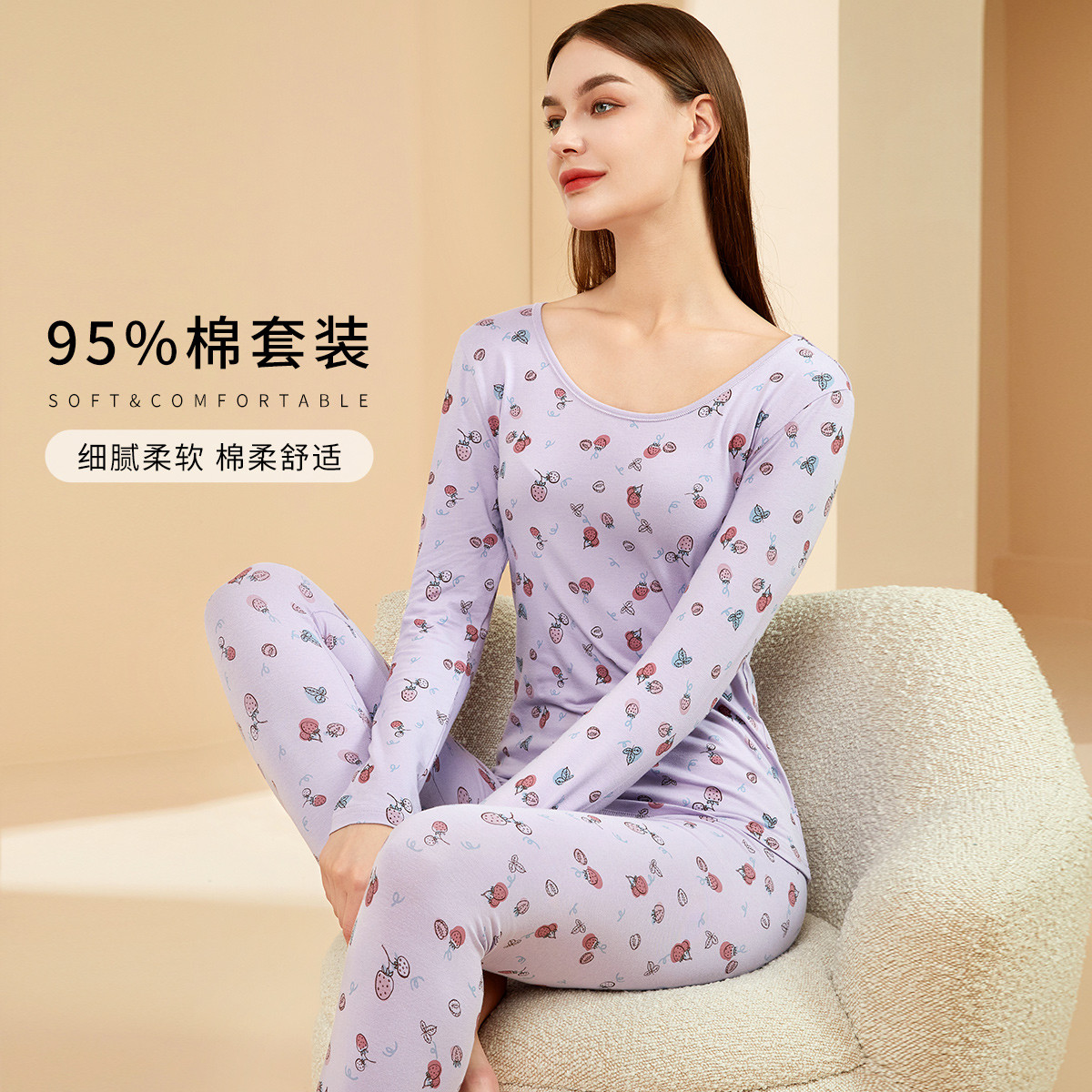 【草莓小花】棉氨保暖内衣女套装舒适柔软长袖秋衣秋裤套装女亲肤 446731