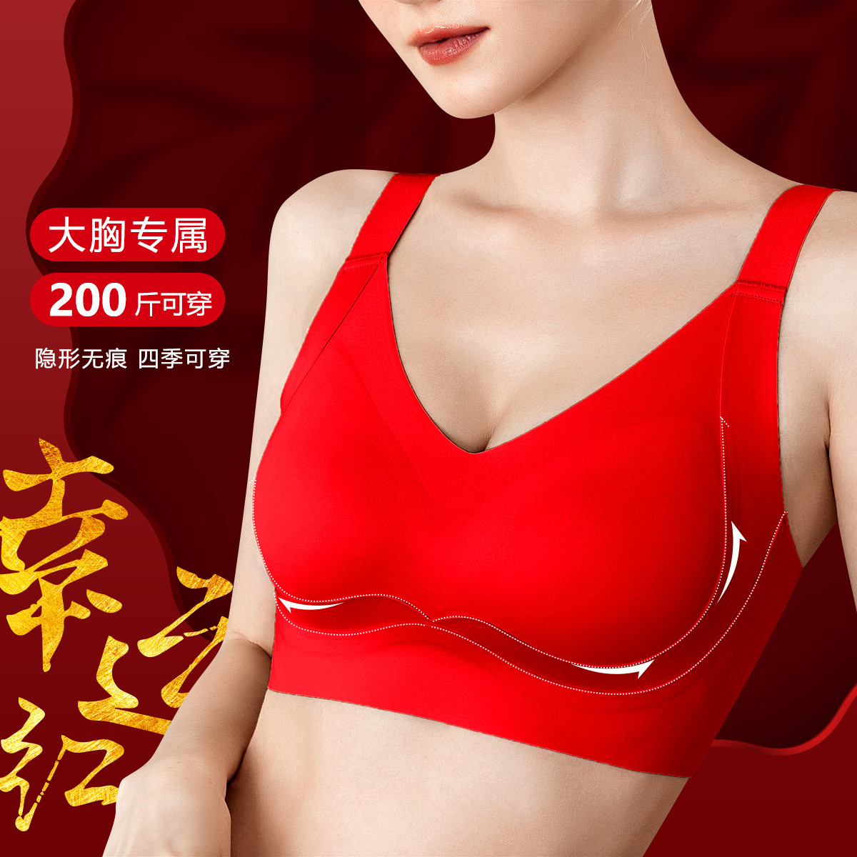 【提拉防下垂】聚拢侧收无痕大红色婚嫁大码内衣女大胸显小文胸罩 266206