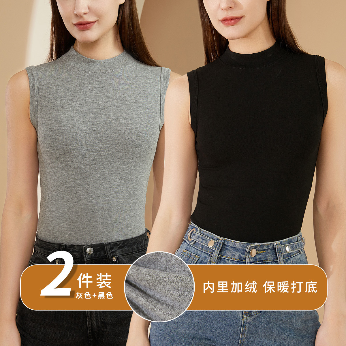 基础经典舒适打底背心女半高领打底衫女春秋女内搭打底无袖2件装 043467
