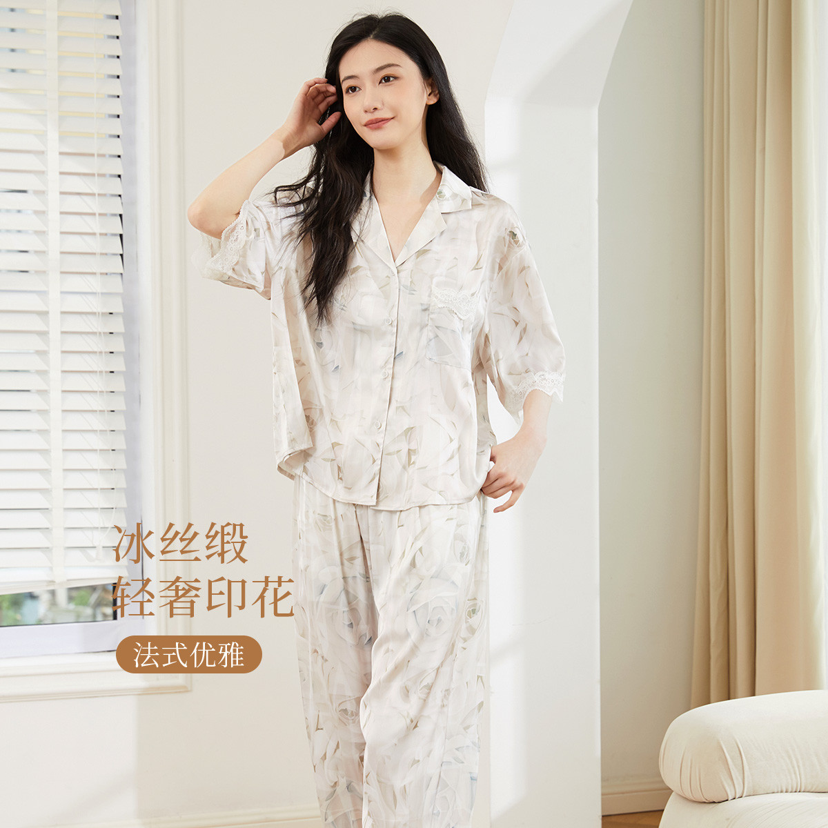 【轻奢玫瑰印花】法式优雅五分袖睡衣女春夏可外穿开衫家居服套装 728331
