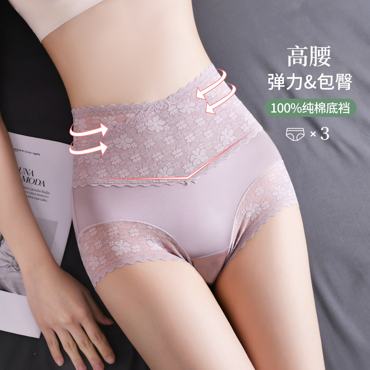 【高腰性感蕾丝】3条装舒适高腰收腹提臀透气纯棉裆女士内裤女 621534