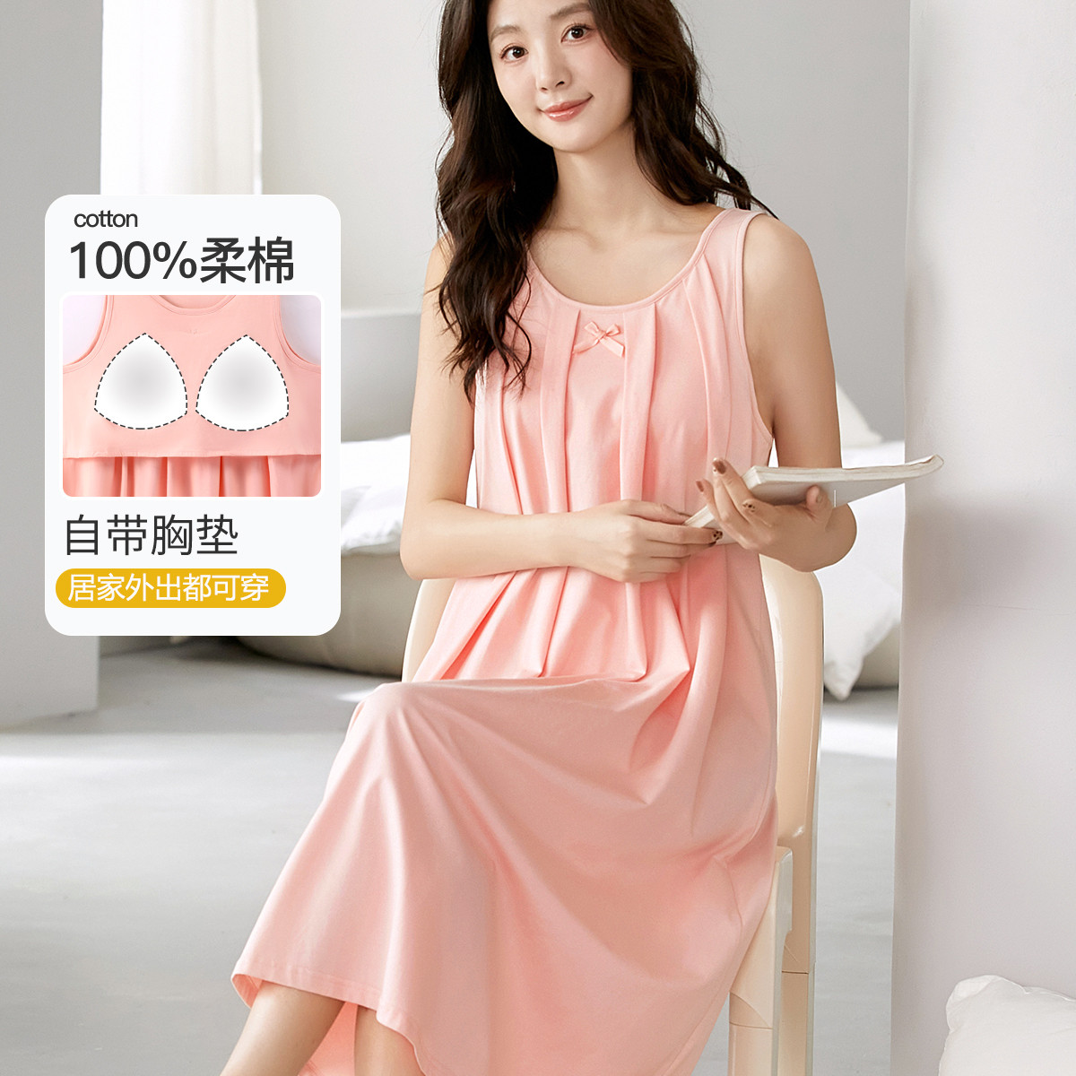 【纯棉防凸点睡裙】春夏新款小清新带胸垫无袖家居服中长连衣裙 716254