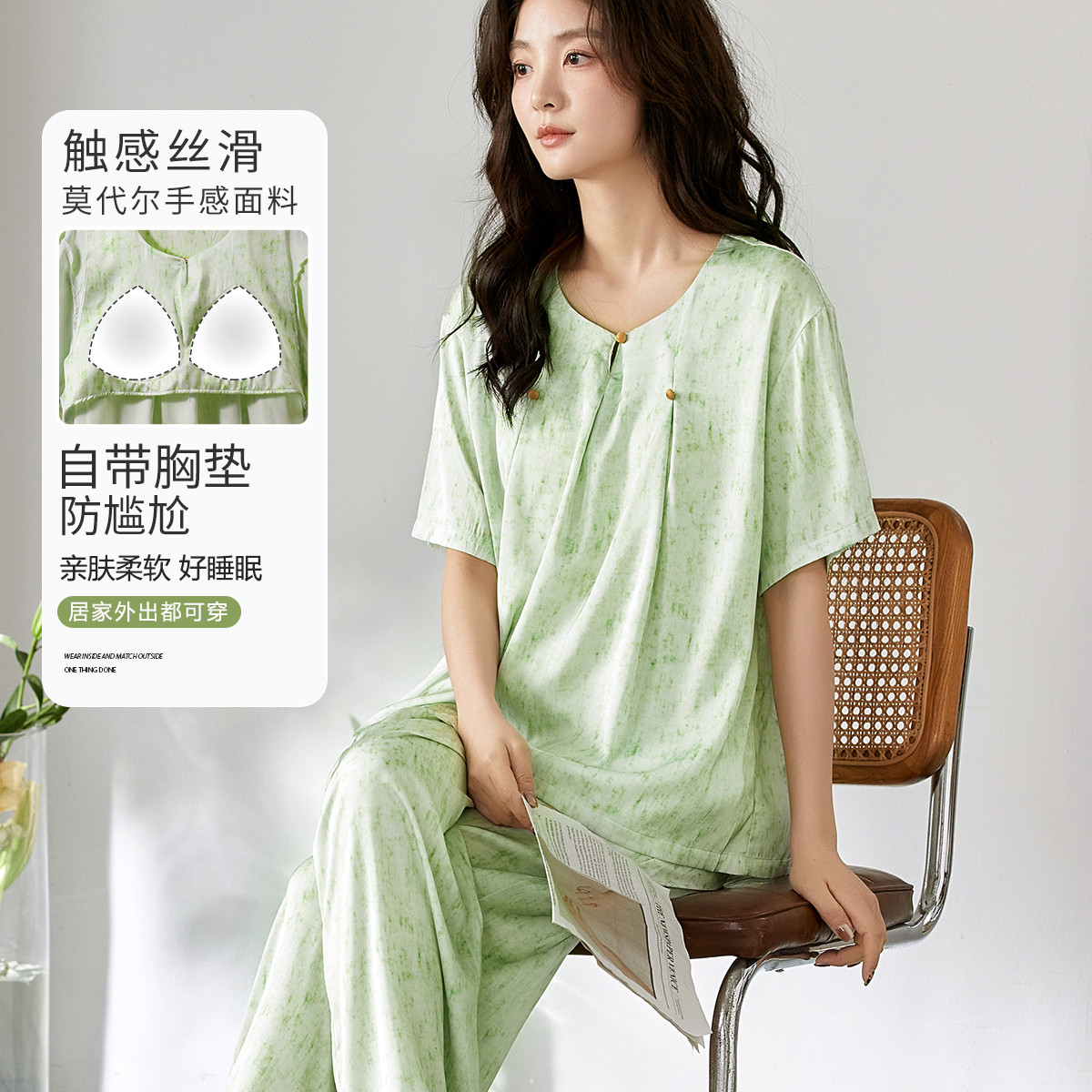 【国风新中式】云感亲肤轻薄舒适带胸垫可外穿女士睡衣家居服套装 427614