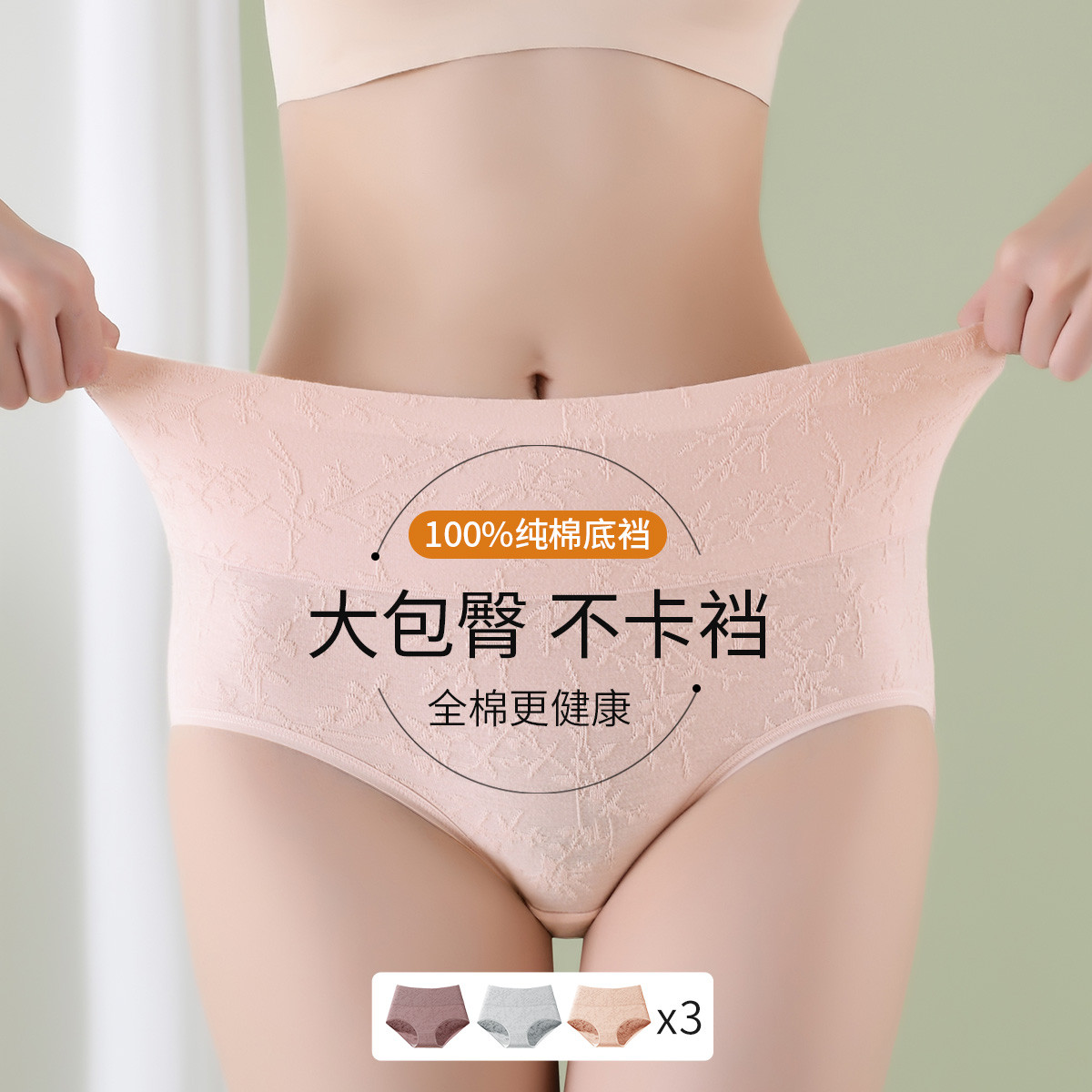 【100%纯棉裆】3条装包臀中高腰收腹国潮提花女士内裤女春夏 457694