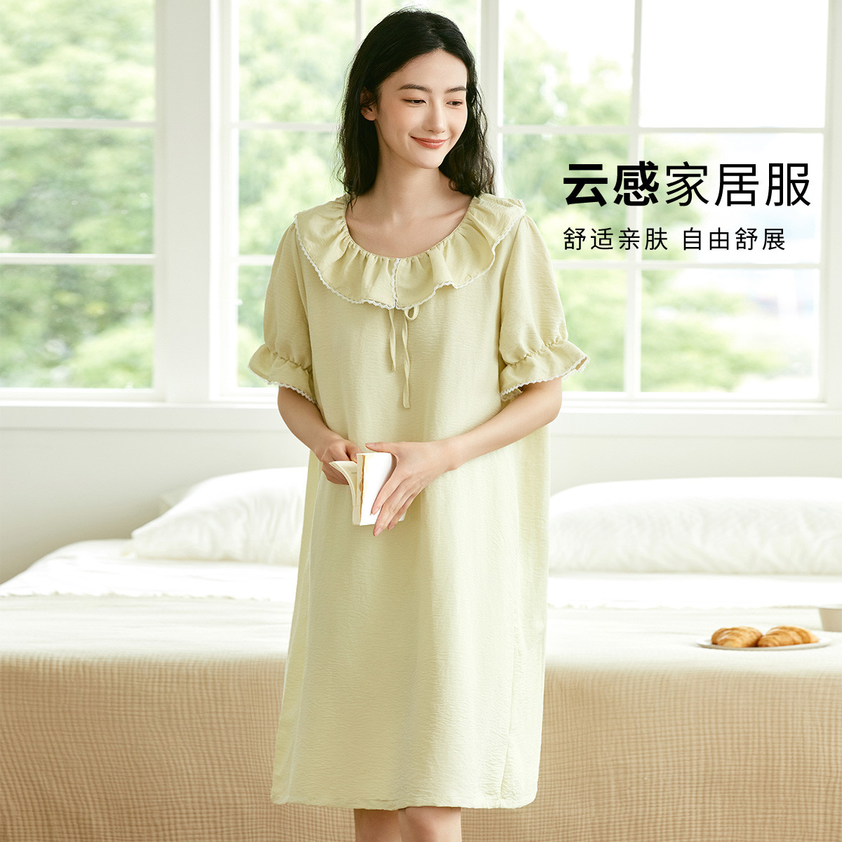 【居家小清新】甜心轻纱圆领荷叶边连衣睡裙夏季女精致小众可外穿 713675
