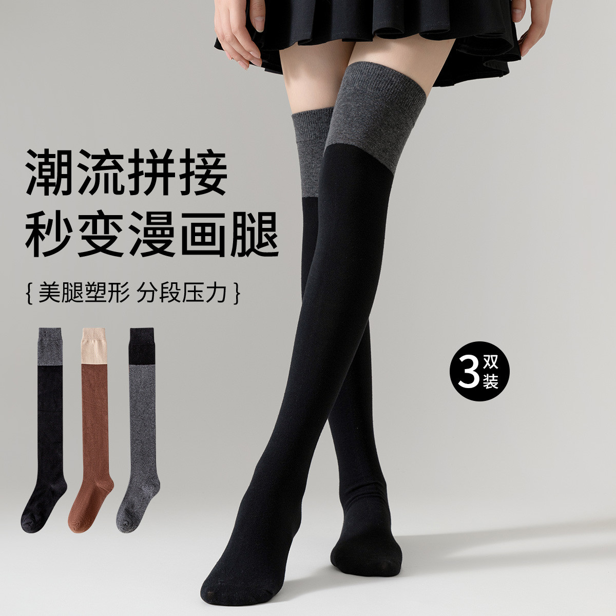 【潮流美腿显瘦】3双装女袜拼接撞色过膝袜舒适棉柔长筒袜ins 597643