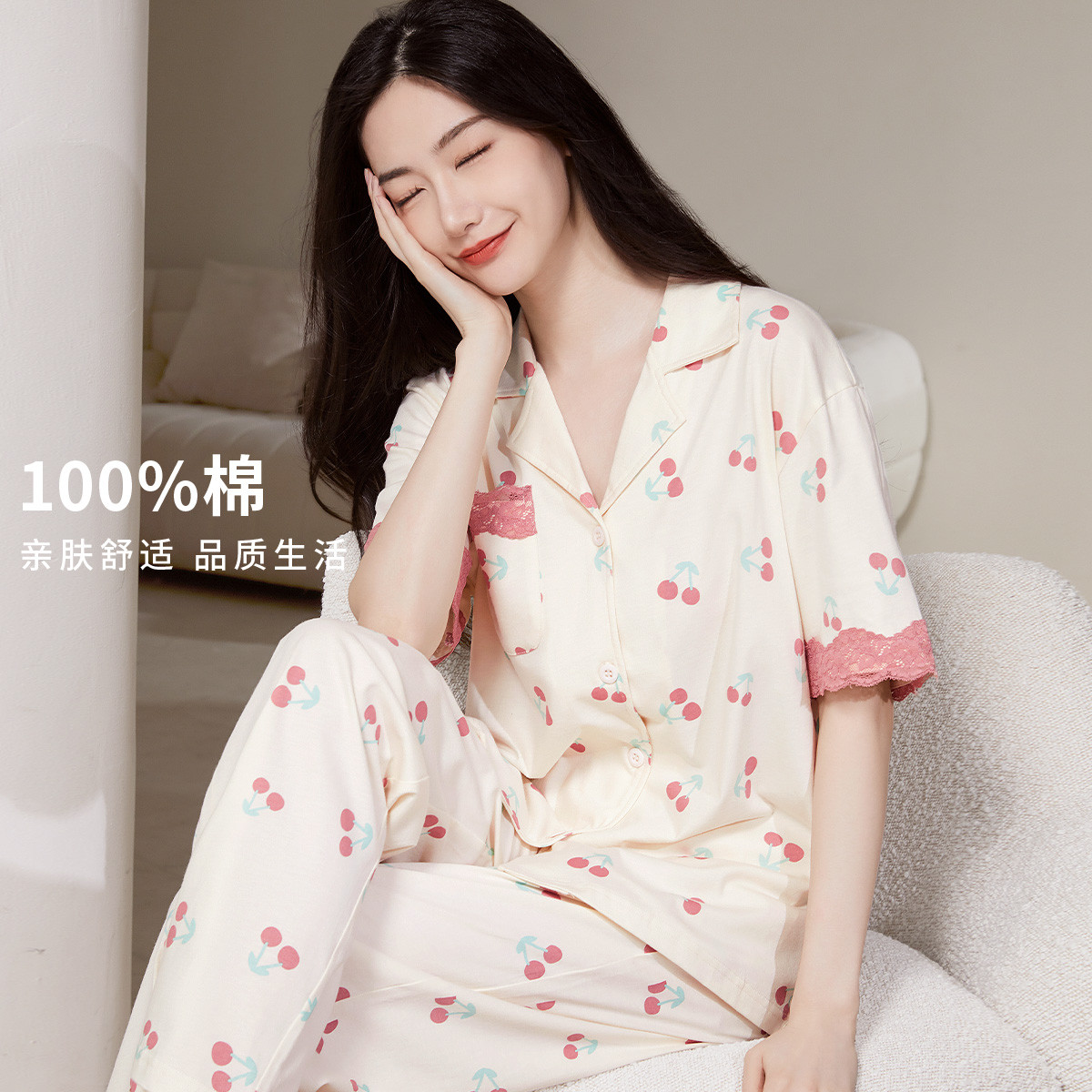 【100%棉】撞色翻领蕾丝套装柔软舒适纯棉睡衣女士家居服 002699