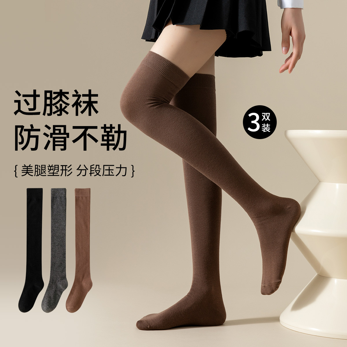 【过膝袜】3双装美腿显瘦女袜春秋款时尚纯色长筒袜舒适棉柔 979467