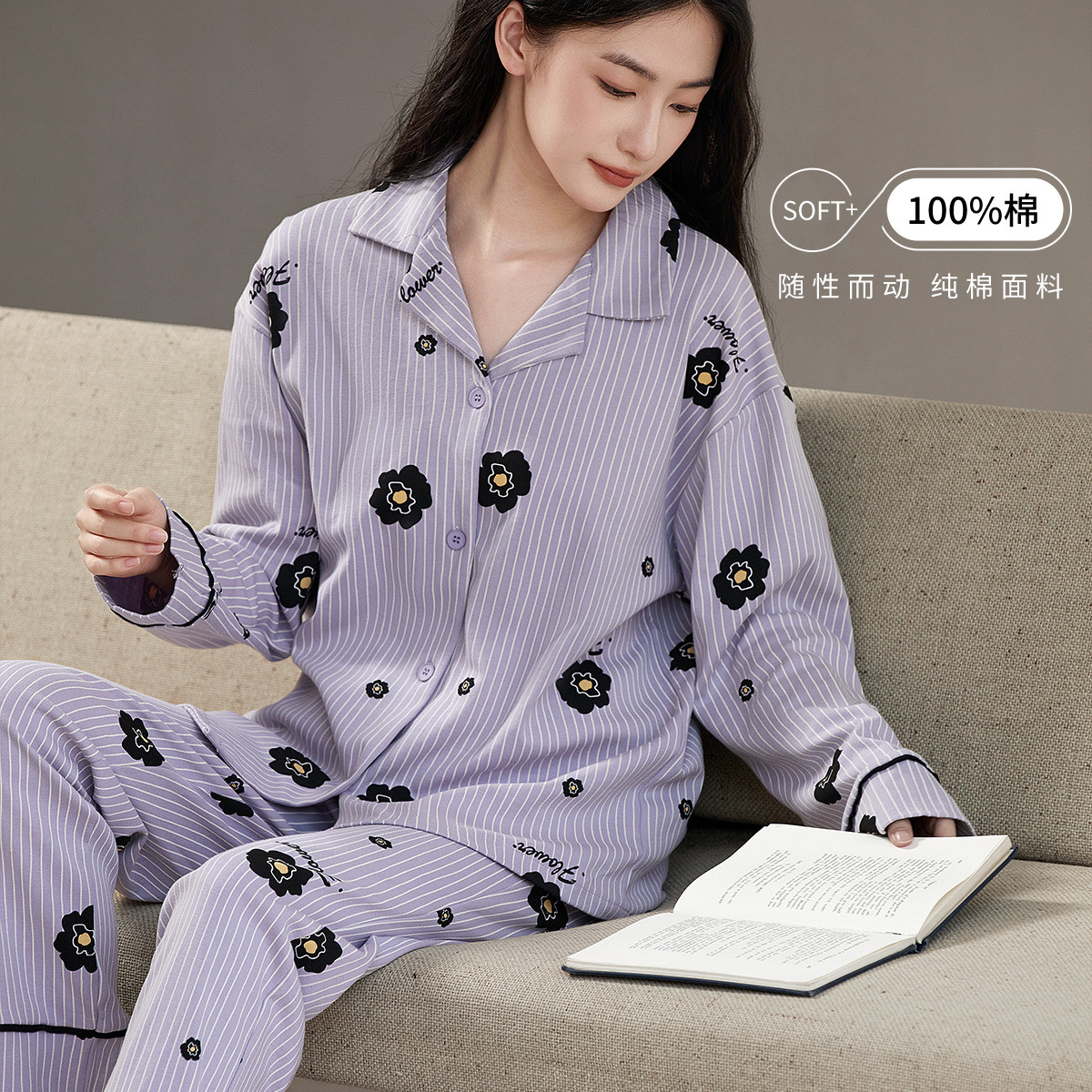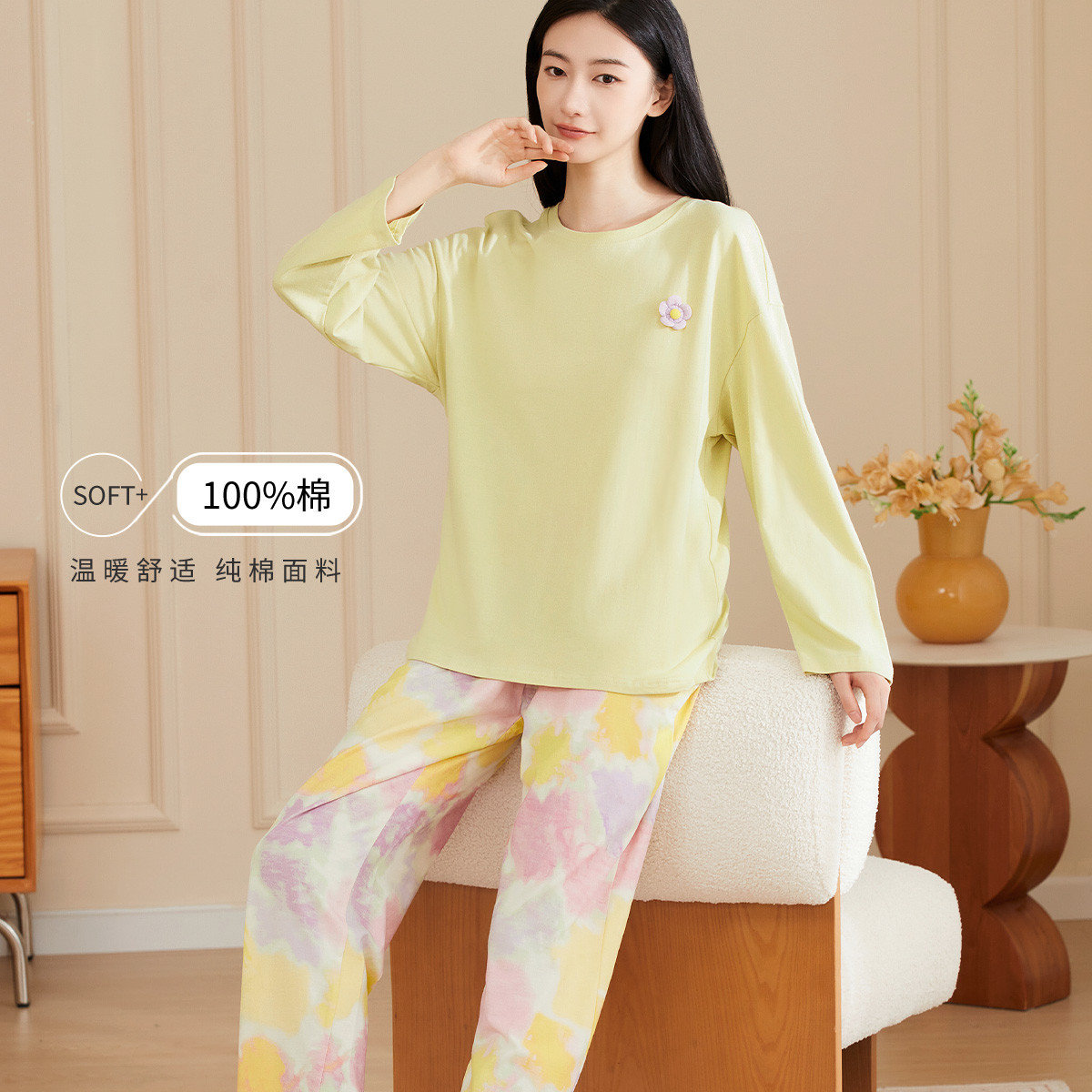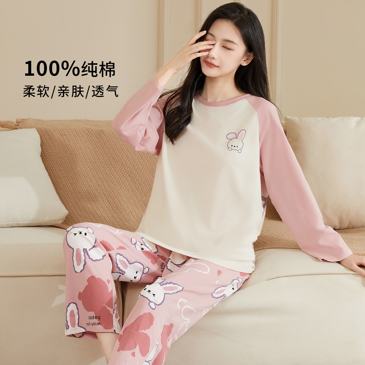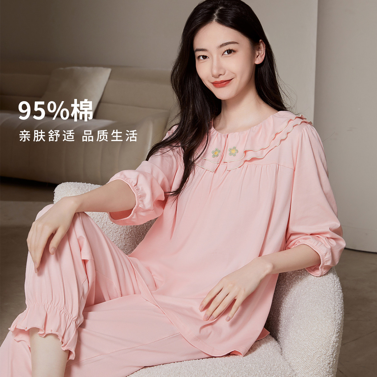 【100%棉】可外穿家居服套装女士春秋款高级感长袖长裤睡衣 607883