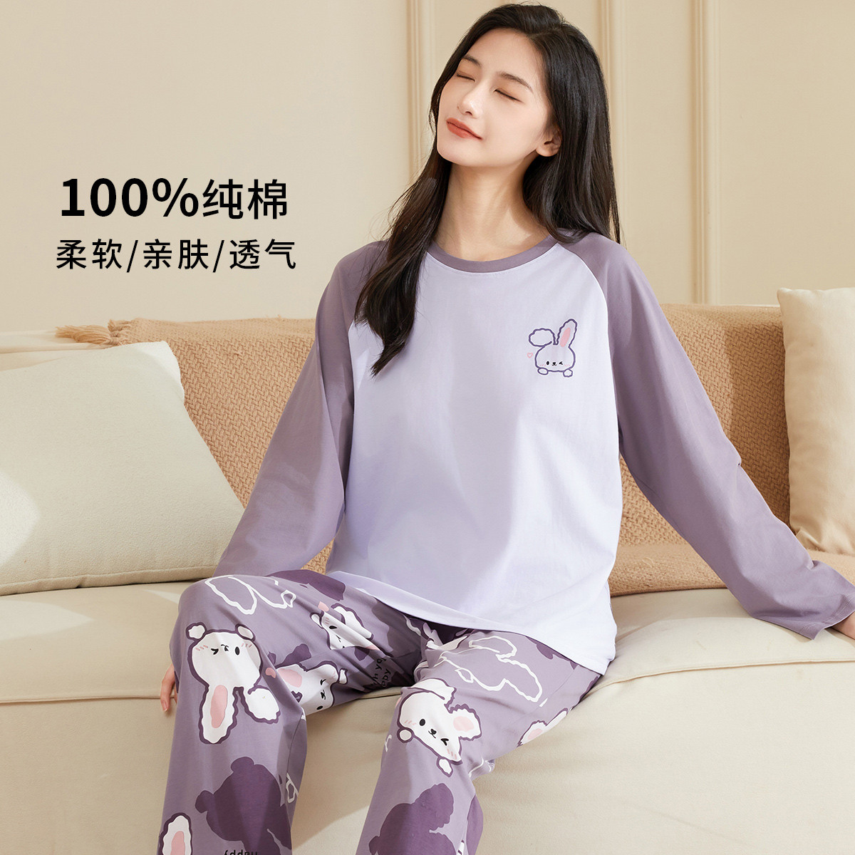 【100%棉】梦幻撞色春秋长袖睡衣纯棉女士家居服舒适柔软套装 805387