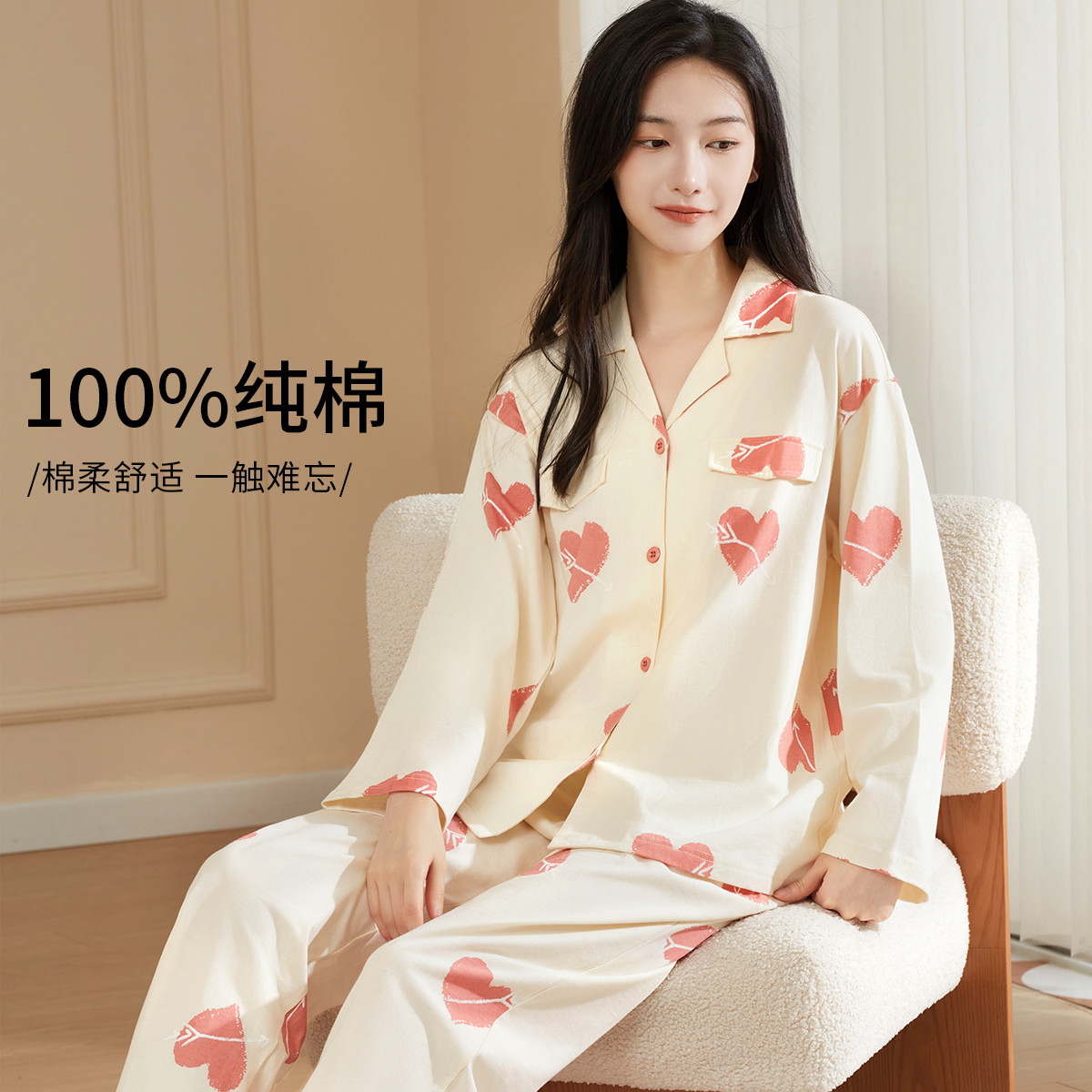 【100%棉】撞色丘比特舒适柔软爱心纯棉睡衣女士家居服套装 878475