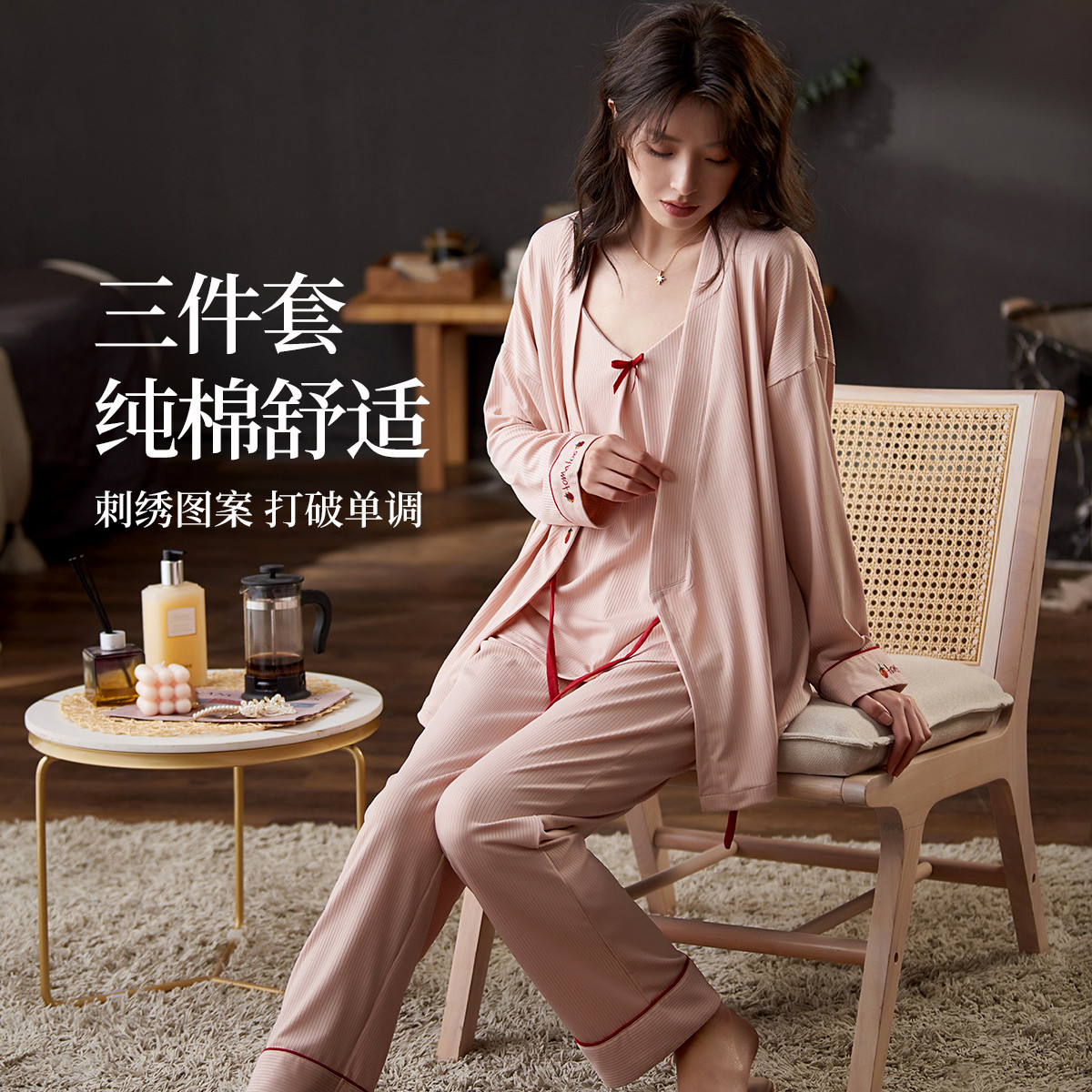 【纯棉三件套】100%棉睡衣女春秋款吊带开衫家居服套装可外穿 693195