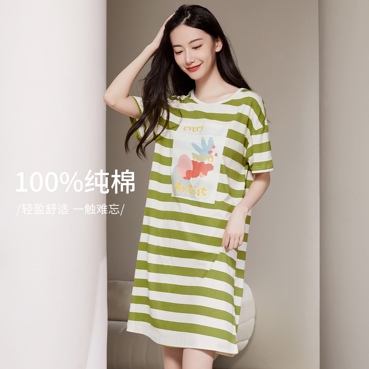 【奶油葡萄100%棉】条纹短袖舒适睡衣裙子女纯棉睡裙清爽柔软 119691