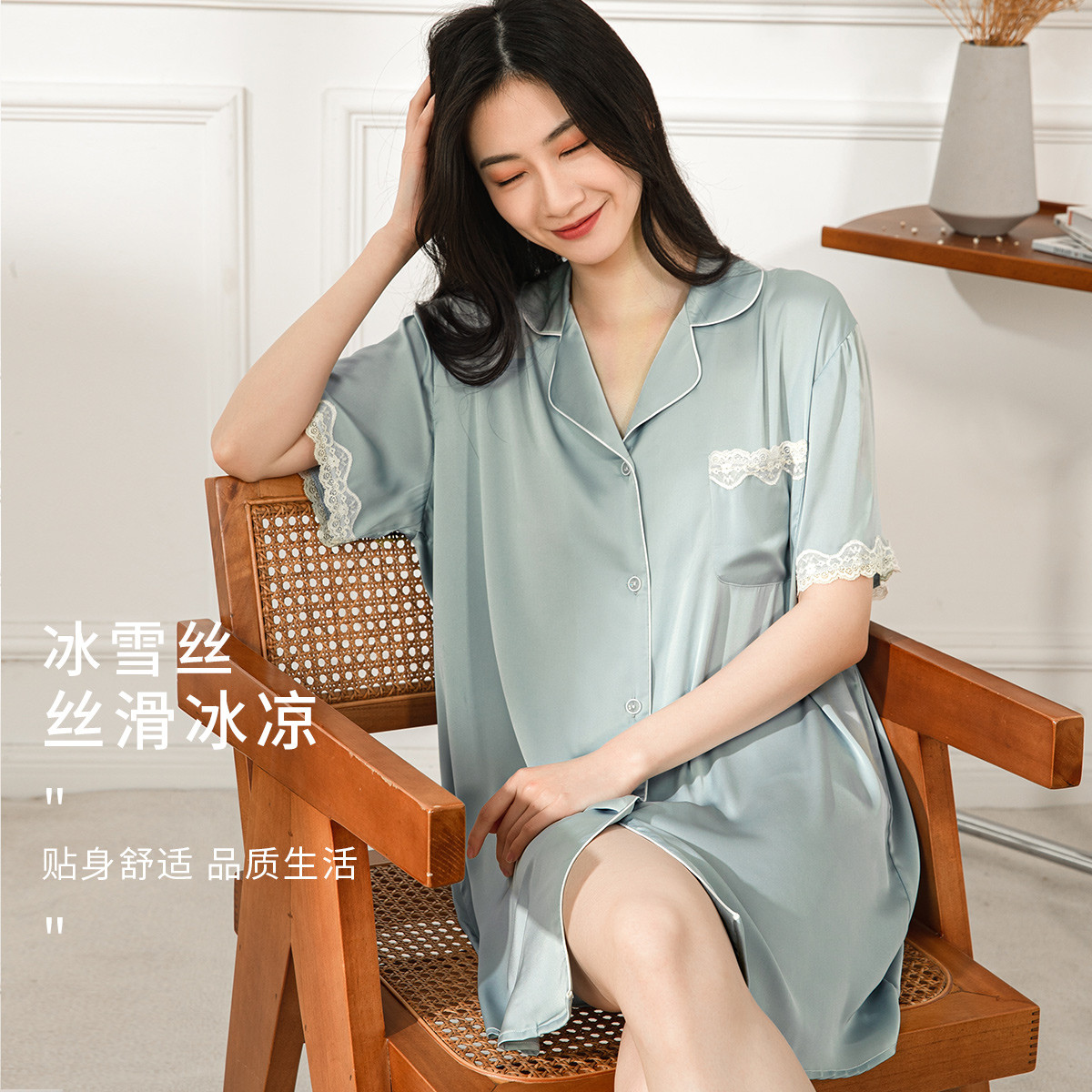 【冰雪丝性感蕾丝】翻领舒适短袖睡衣女透气舒适柔顺睡裙子女 420107
