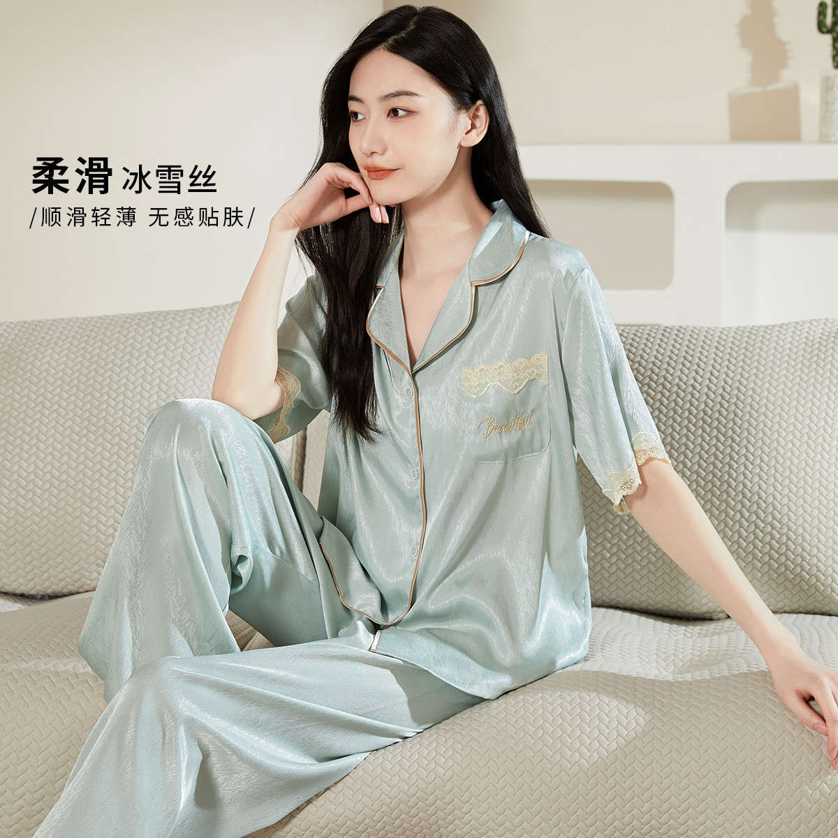 【薄荷椰椰冰雪丝】顺滑舒适睡衣女士家居服柔软蕾丝短袖套装 025611
