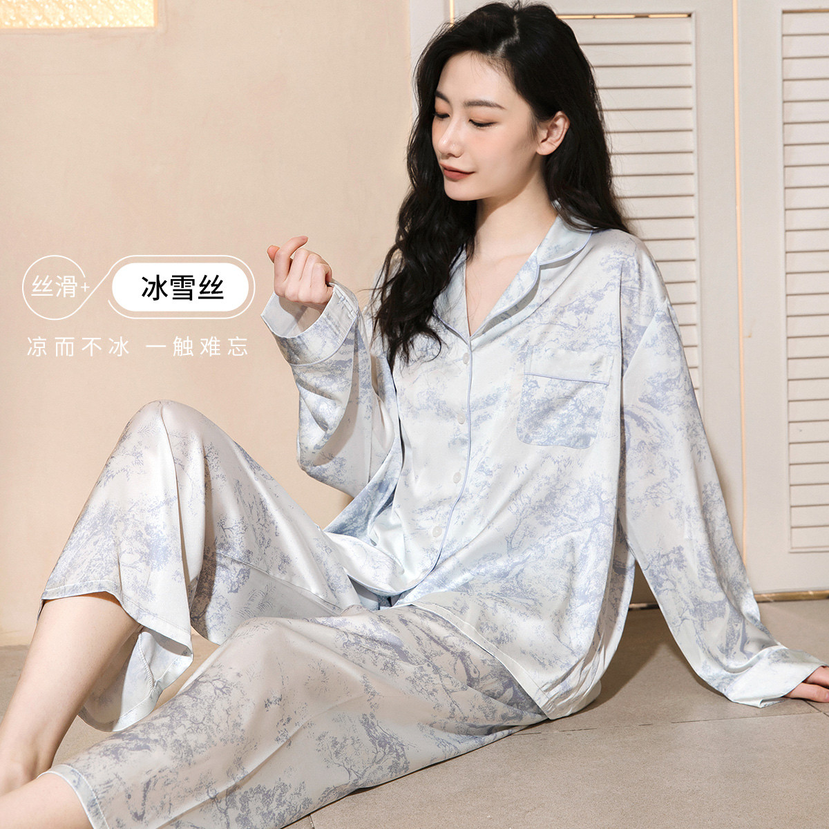 【奶泡碎冰冰雪丝】拼色舒适睡衣女家居服春秋长袖翻领柔软套装 093451