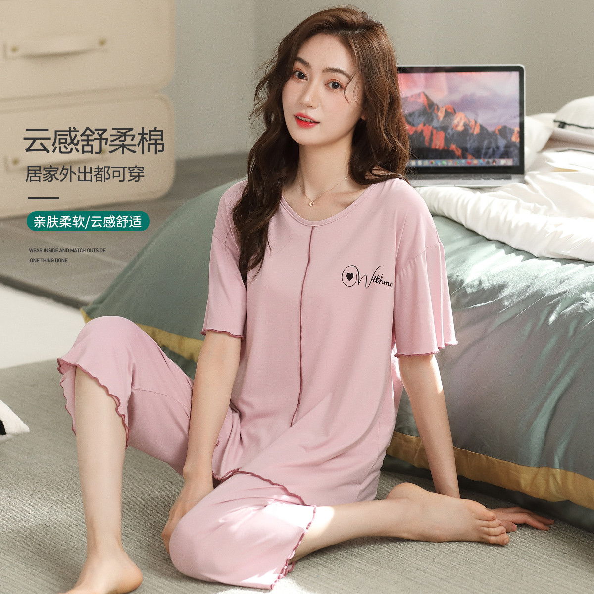 夏季短袖七分裤女士家居服套装可外穿棉质柔软款式舒适睡衣女 977694